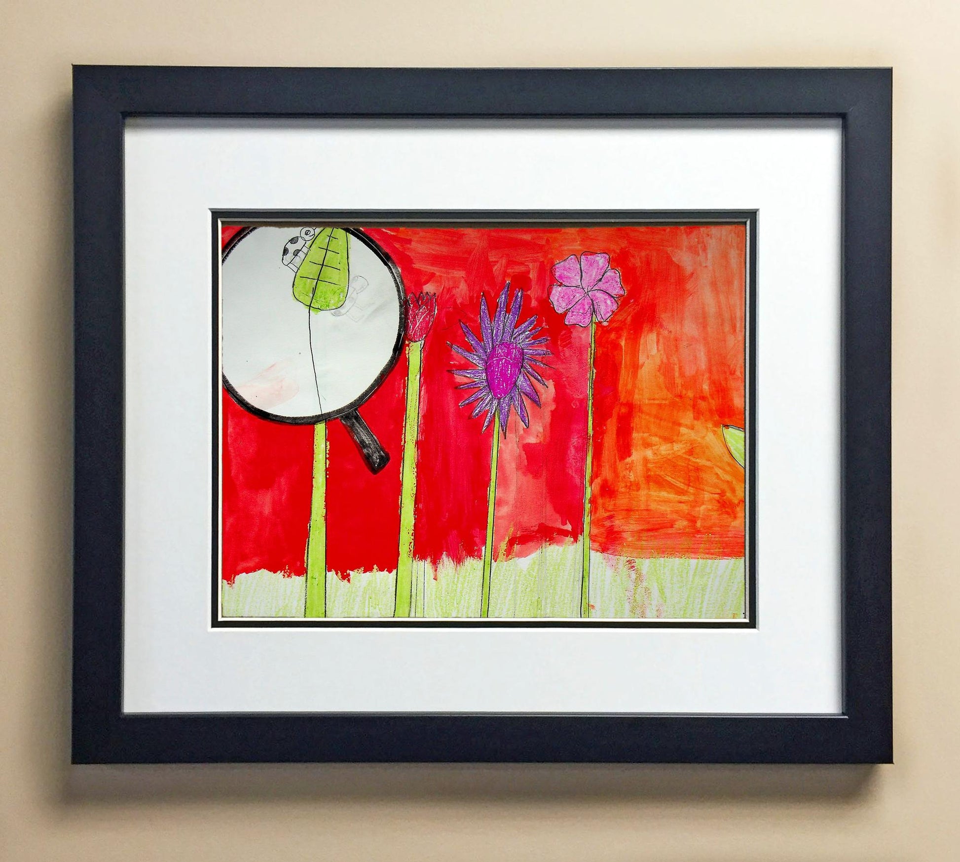 Included with the purchase is the Students Artwork, Frame, double matboard, shatter proof plexiglass, and a ready to hang backerboard with turnbuttons