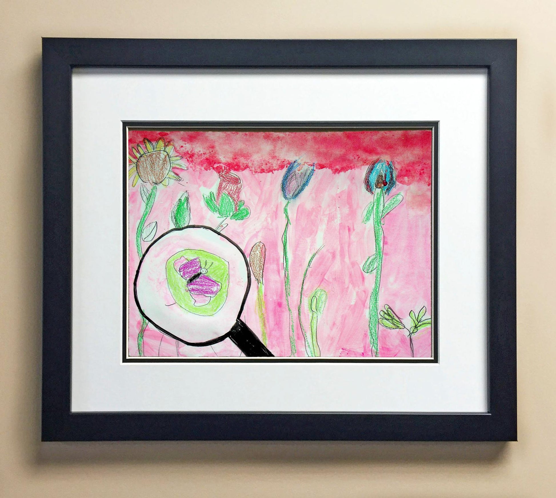 Included with the purchase is the Students Artwork, Frame, double matboard, shatter proof plexiglass, and a ready to hang backerboard with turnbuttons