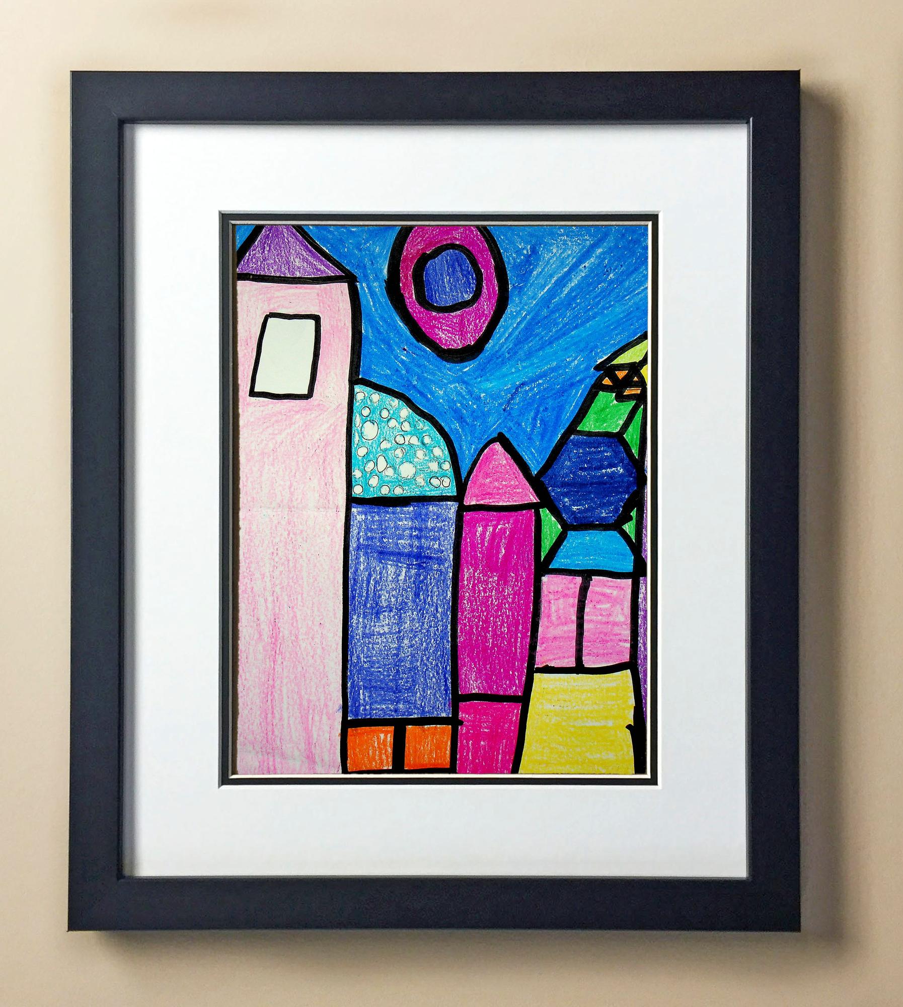 Included with the purchase is the Students Artwork, Frame, double matboard, shatter proof plexiglass, and a ready to hang backerboard with turnbuttons