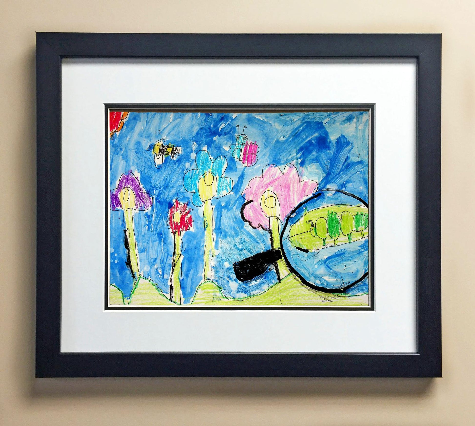 Included with the purchase is the Students Artwork, Frame, double matboard, shatter proof plexiglass, and a ready to hang backerboard with turnbuttons