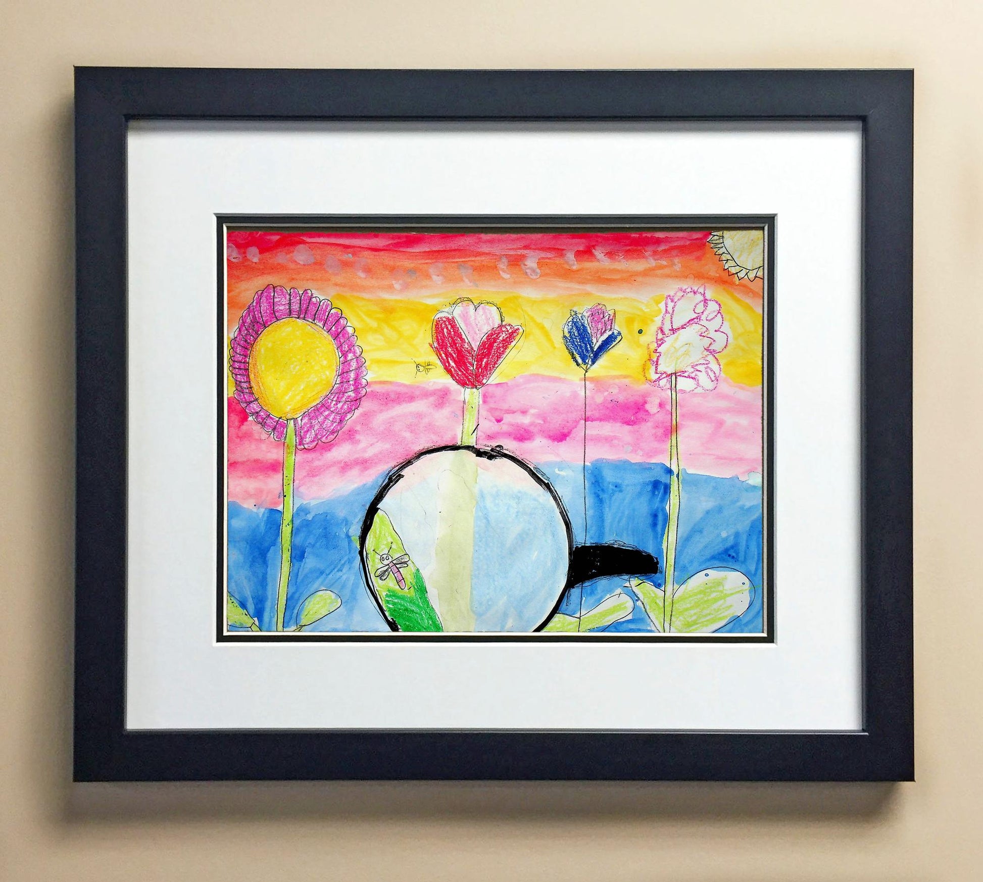 Included with the purchase is the Students Artwork, Frame, double matboard, shatter proof plexiglass, and a ready to hang backerboard with turnbuttons
