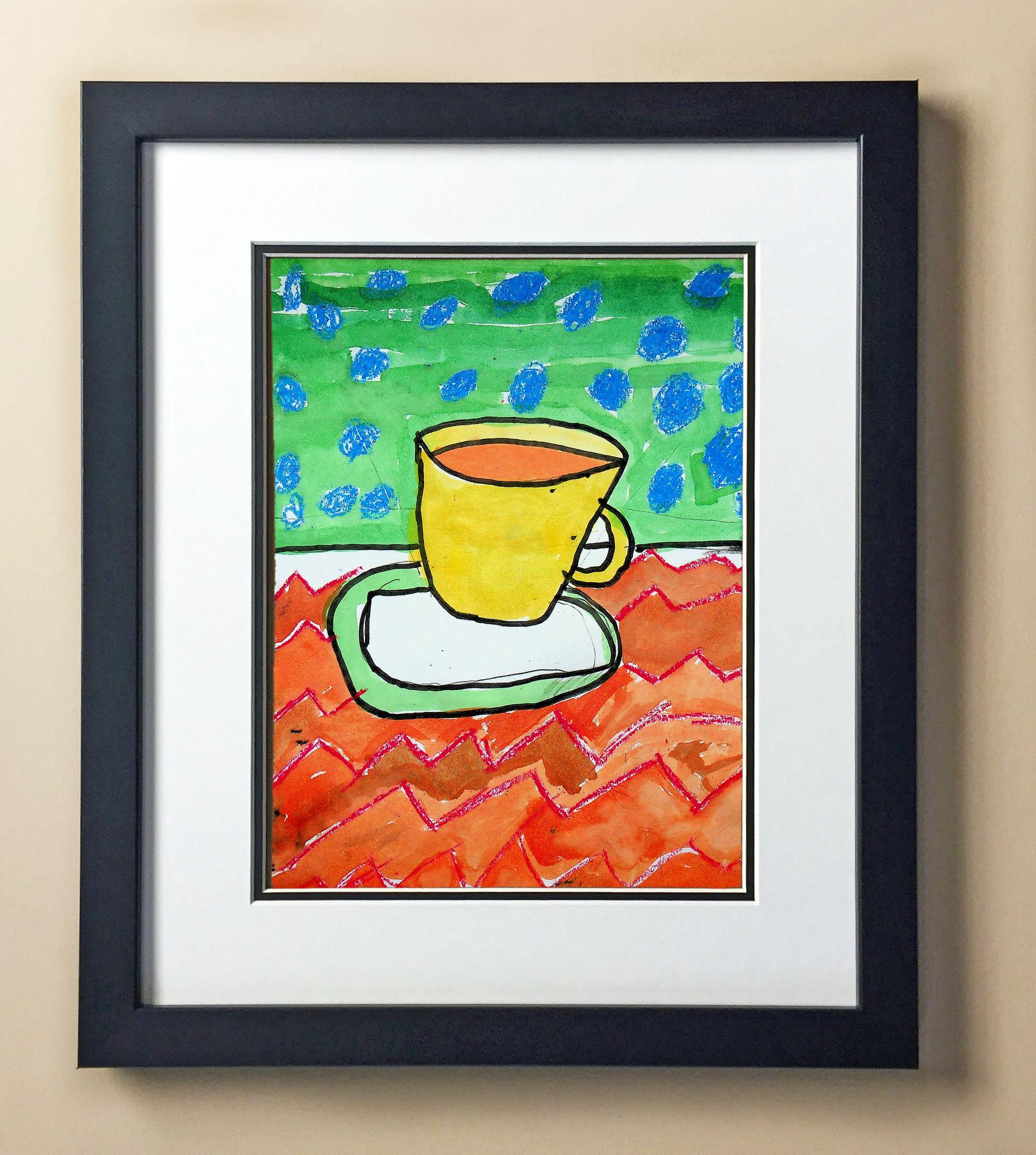 Included with the purchase is the Students Artwork, Frame, double matboard, shatter proof plexiglass, and a ready to hang backerboard with turnbuttons