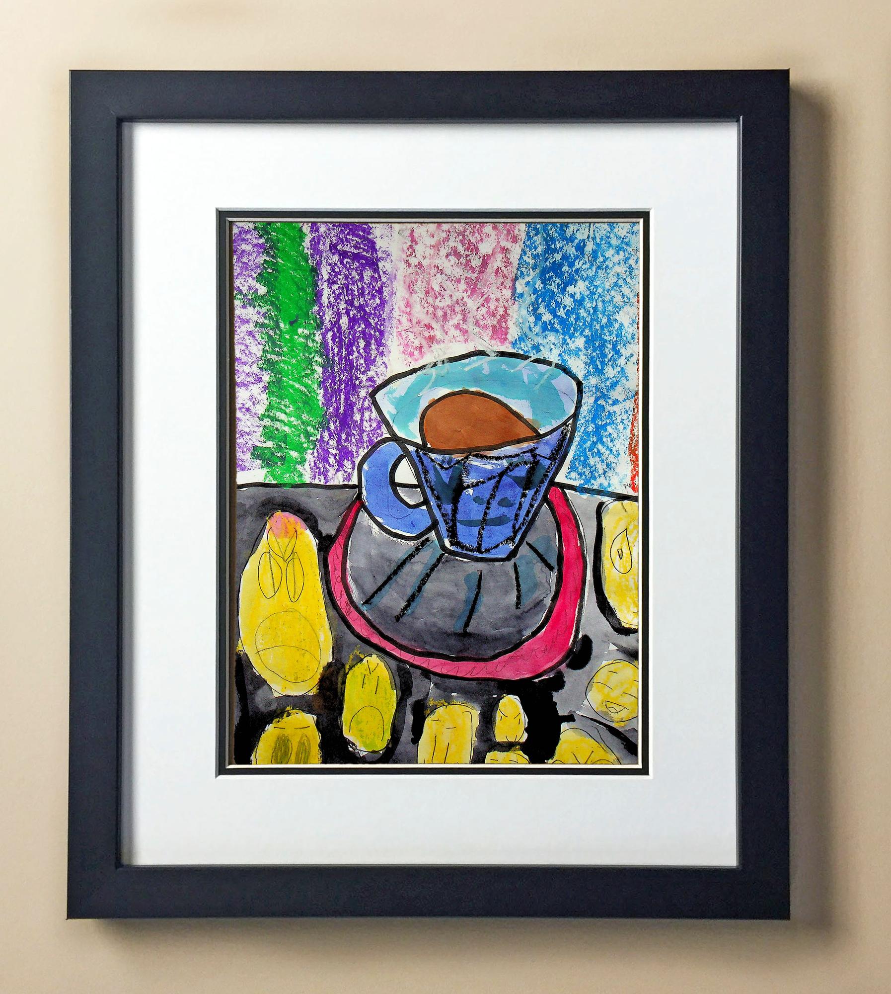 Included with the purchase is the Students Artwork, Frame, double matboard, shatter proof plexiglass, and a ready to hang backerboard with turnbuttons