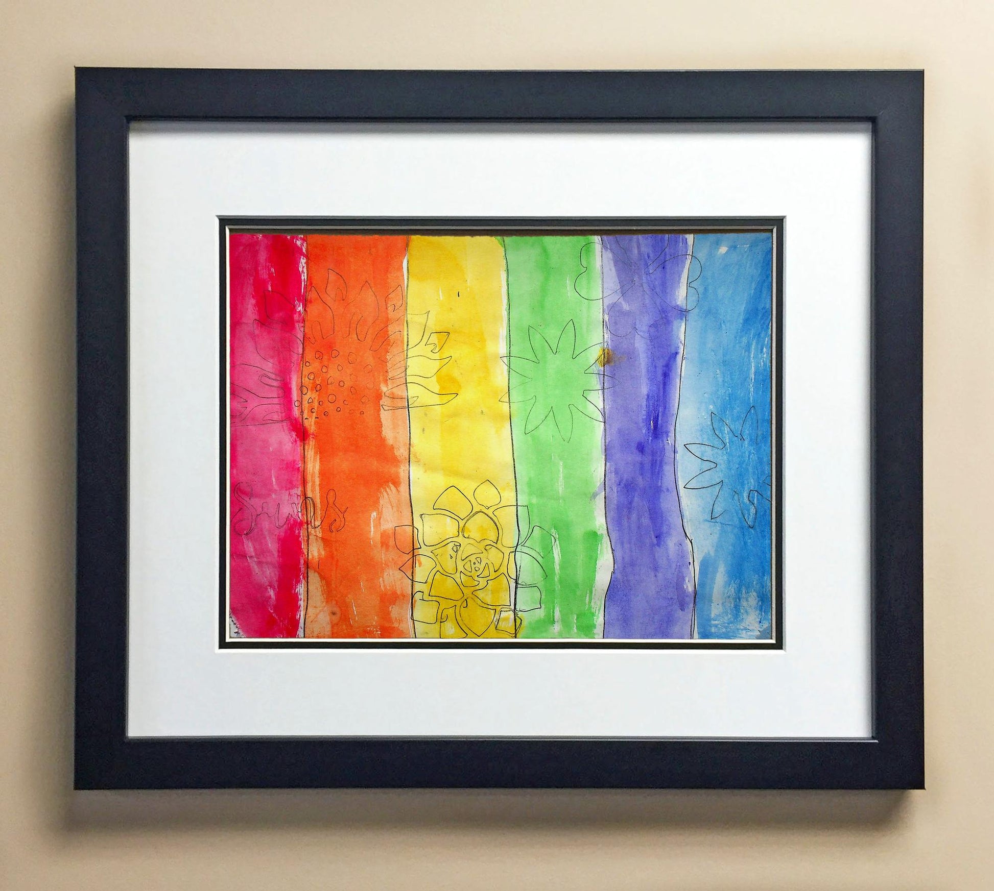 Included with the purchase is the Students Artwork, Frame, double matboard, shatter proof plexiglass, and a ready to hang backerboard with turnbuttons