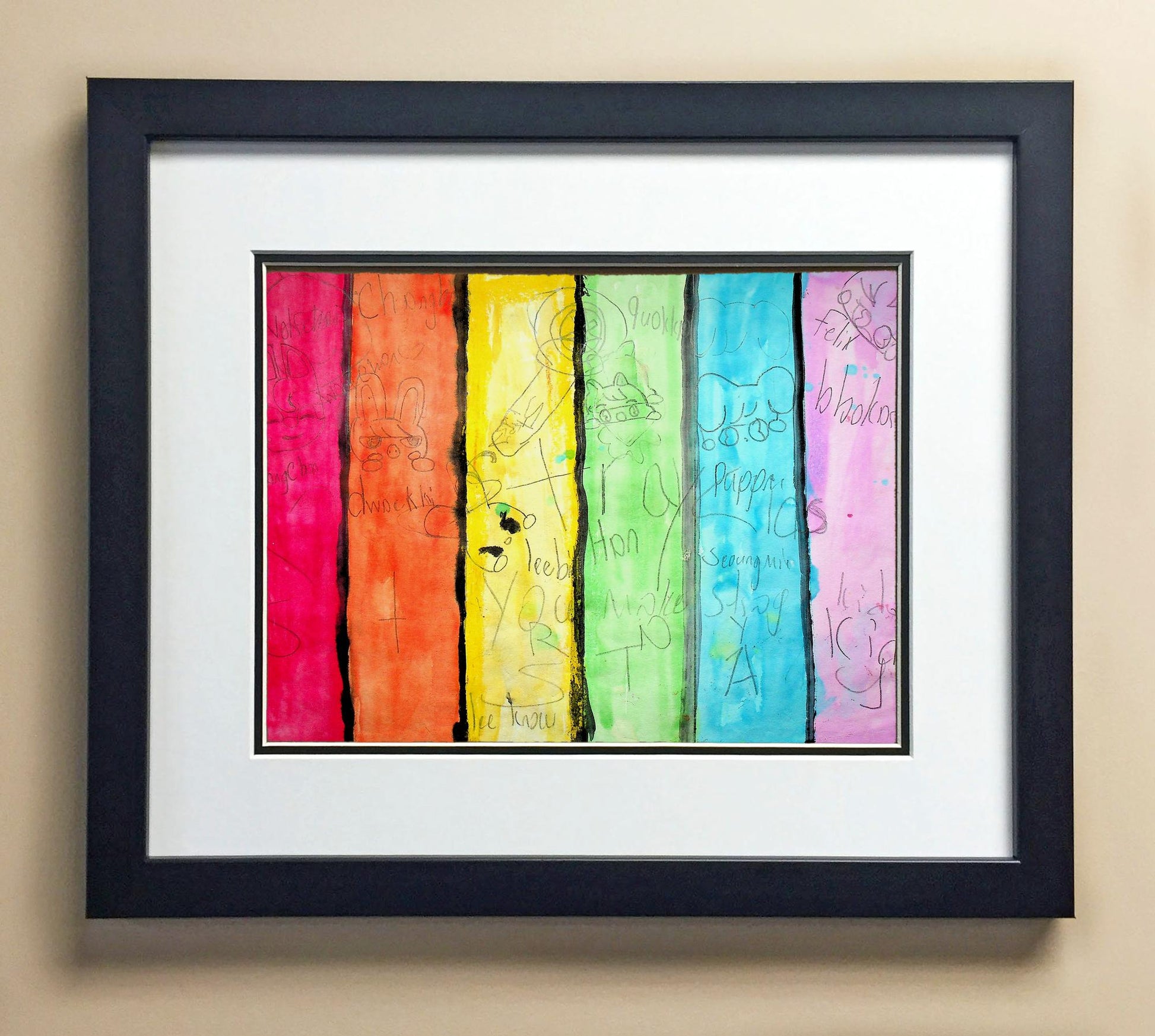 Included with the purchase is the Students Artwork, Frame, double matboard, shatter proof plexiglass, and a ready to hang backerboard with turnbuttons