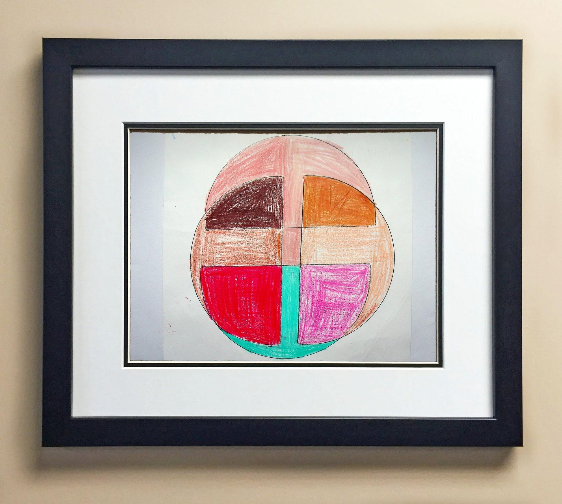Included with the purchase is the Students Artwork, Frame, double matboard, shatter proof plexiglass, and a ready to hang backerboard with turnbuttons