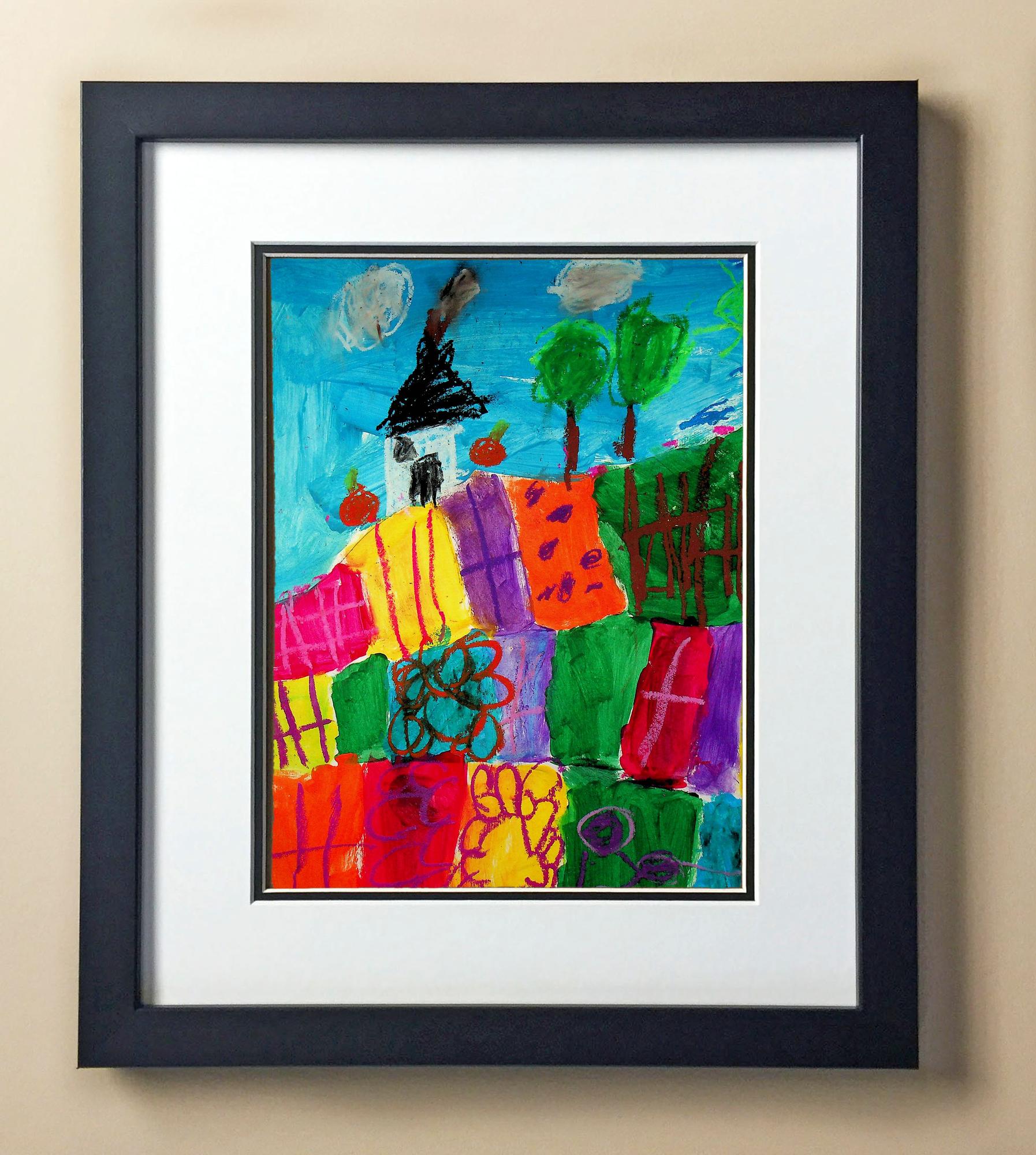 Included with the purchase is the Students Artwork, Frame, double matboard, shatter proof plexiglass, and a ready to hang backerboard with turnbuttons
