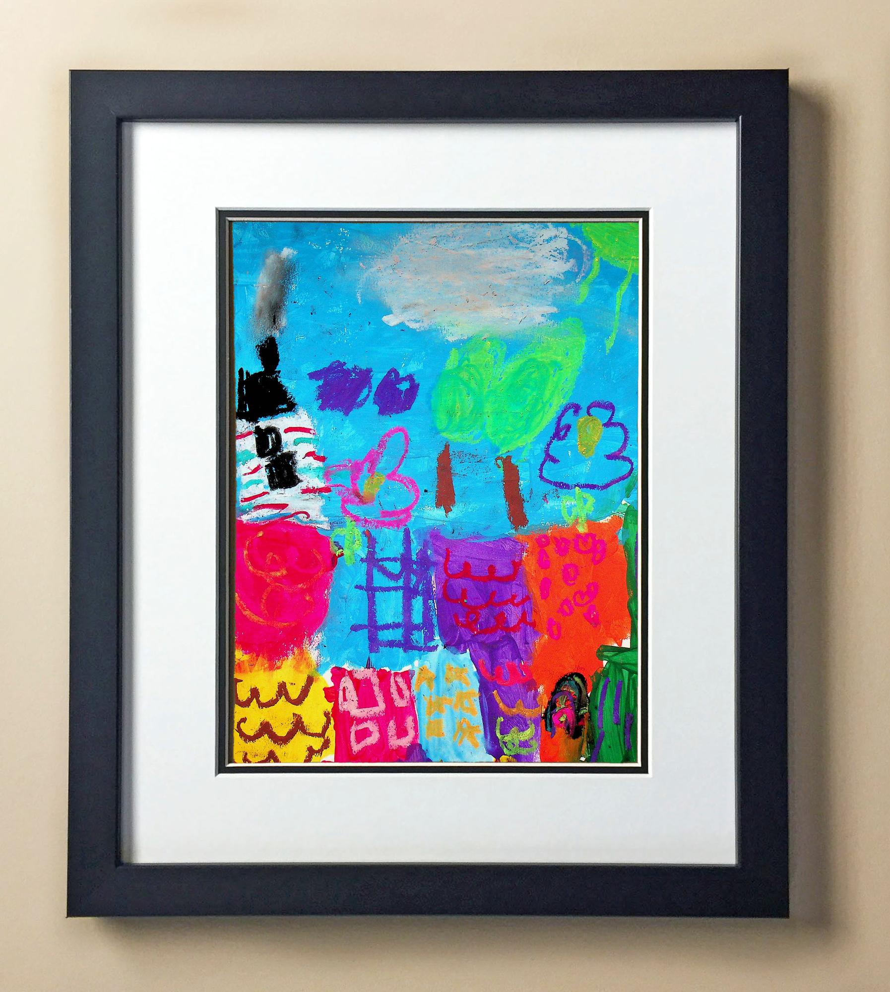 Included with the purchase is the Students Artwork, Frame, double matboard, shatter proof plexiglass, and a ready to hang backerboard with turnbuttons