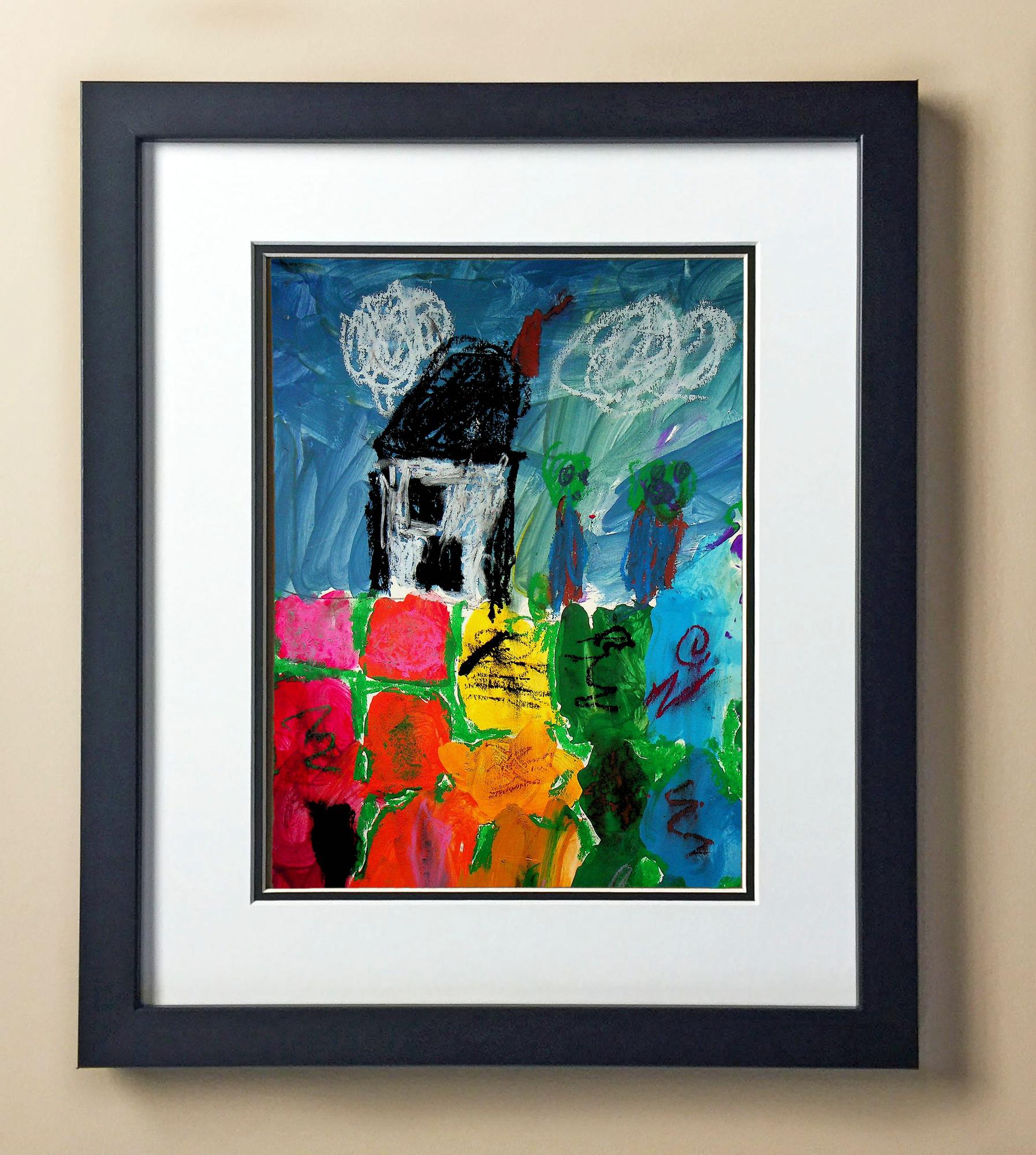 Included with the purchase is the Students Artwork, Frame, double matboard, shatter proof plexiglass, and a ready to hang backerboard with turnbuttons