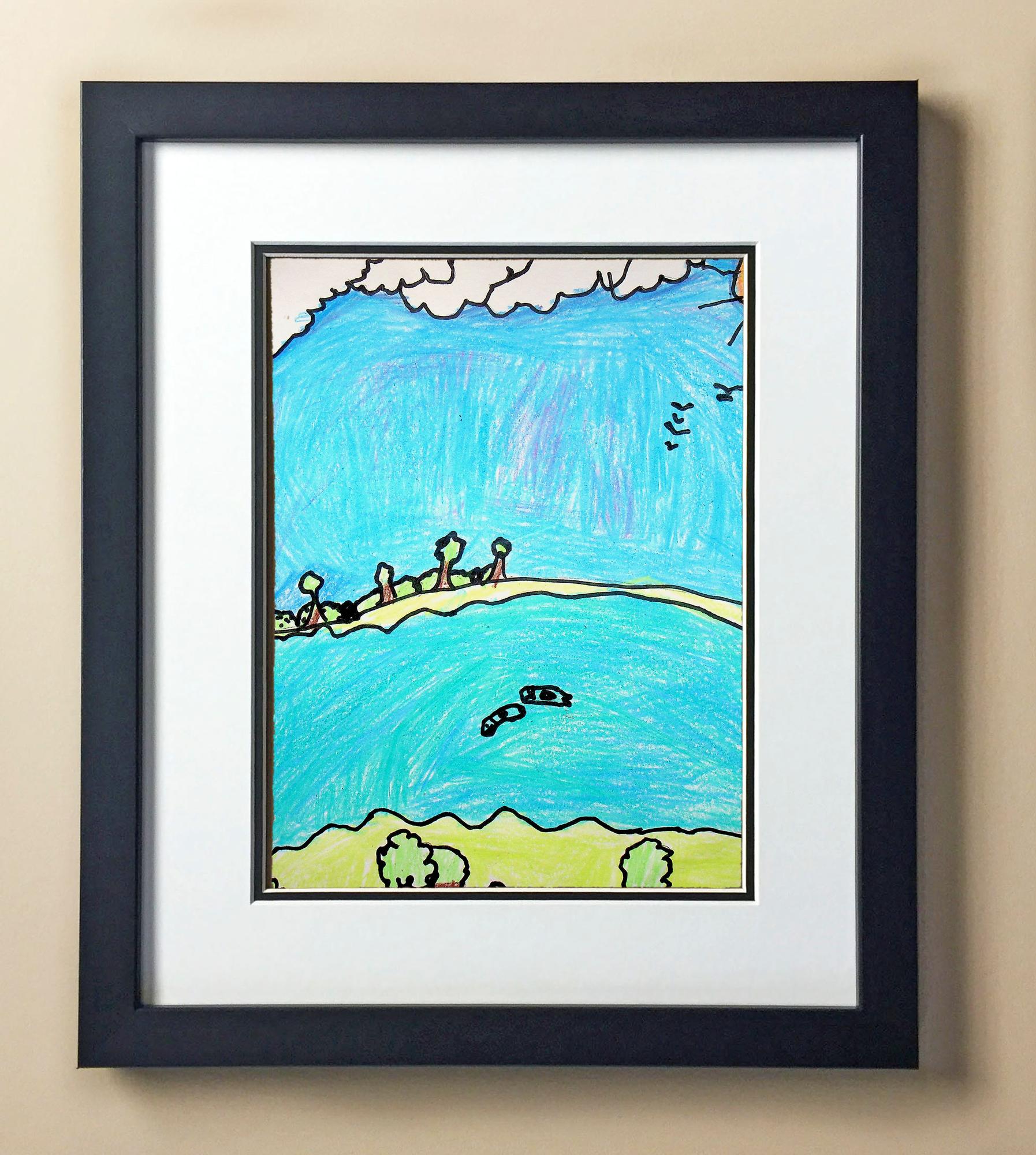 Included with the purchase is the Students Artwork, Frame, double matboard, shatter proof plexiglass, and a ready to hang backerboard with turnbuttons