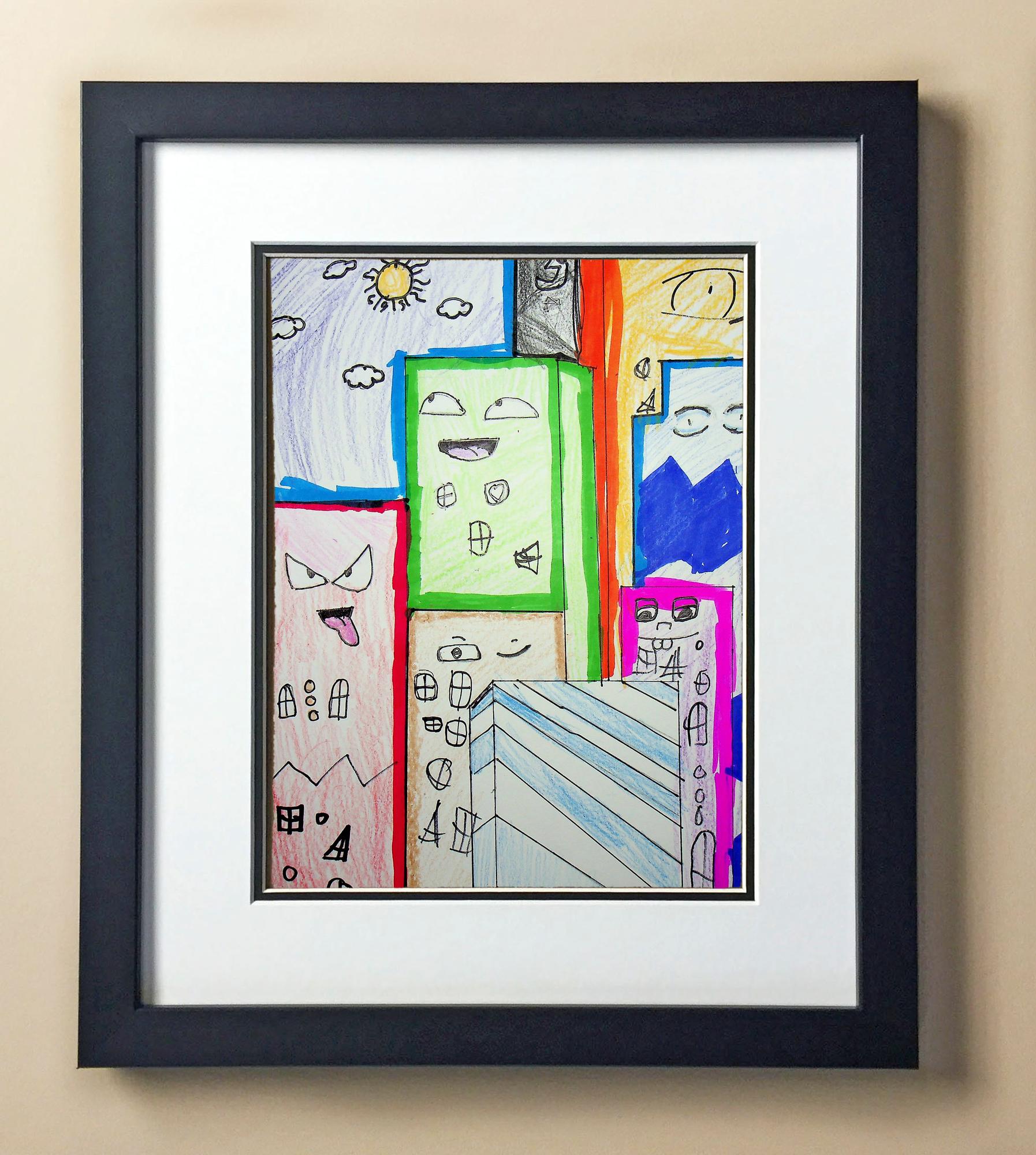 Included with the purchase is the Students Artwork, Frame, double matboard, shatter proof plexiglass, and a ready to hang backerboard with turnbuttons