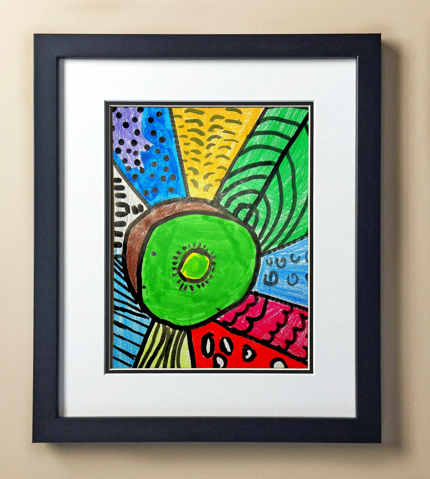 Included with the purchase is the Students Artwork, Frame, double matboard, shatter proof plexiglass, and a ready to hang backerboard with turnbuttons