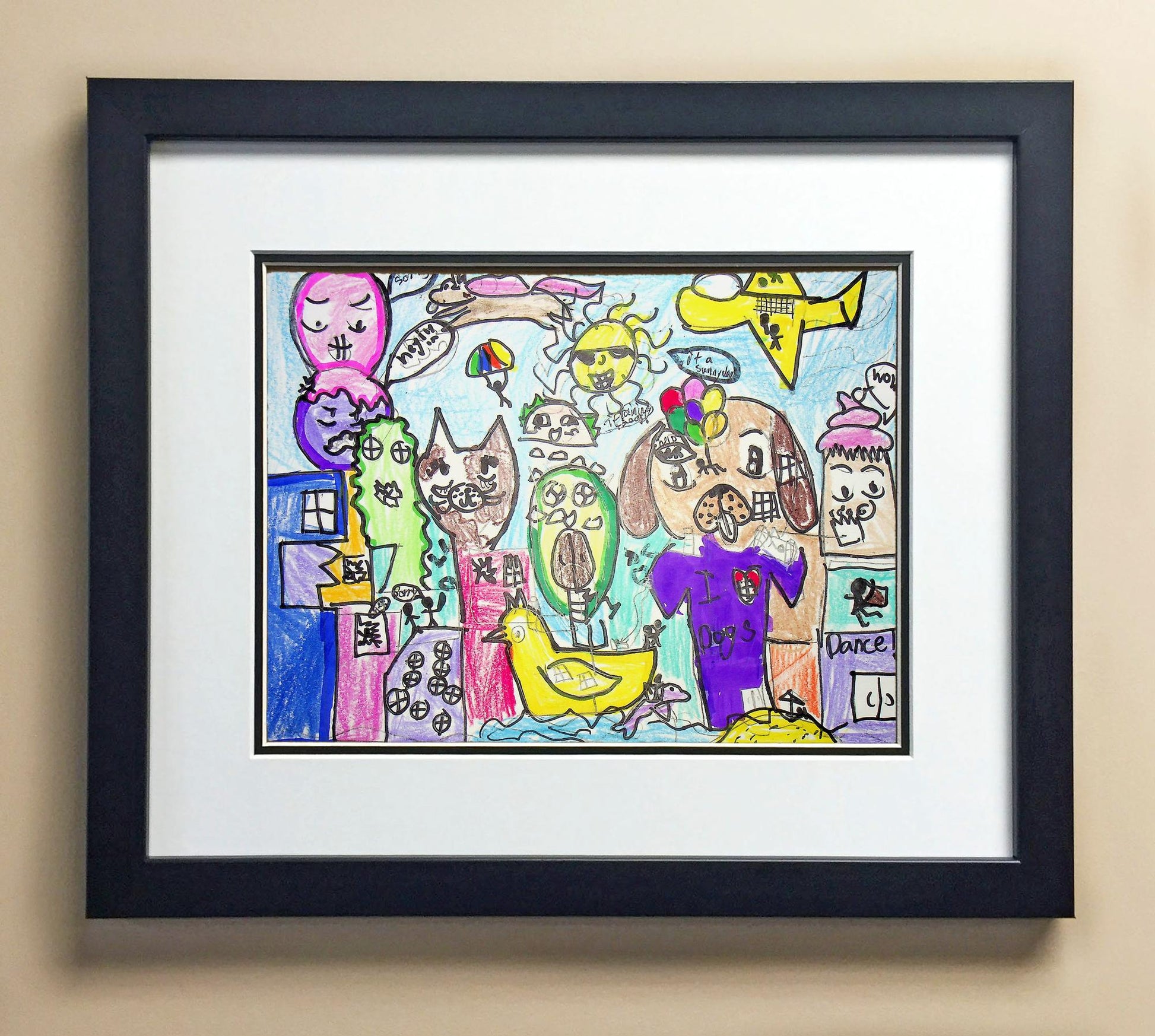 Included with the purchase is the Students Artwork, Frame, double matboard, shatter proof plexiglass, and a ready to hang backerboard with turnbuttons