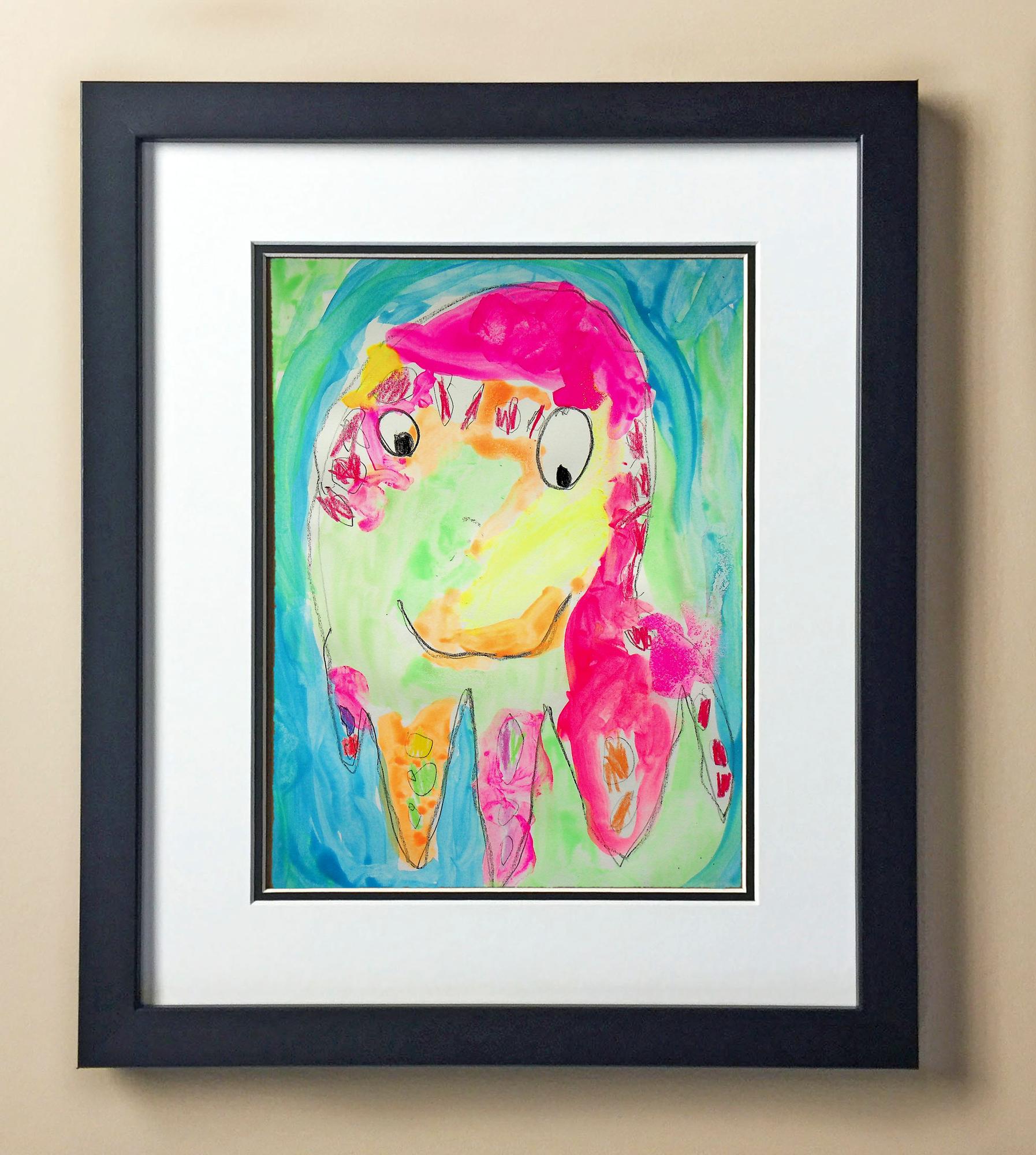 Included with the purchase is the Students Artwork, Frame, double matboard, shatter proof plexiglass, and a ready to hang backerboard with turnbuttons