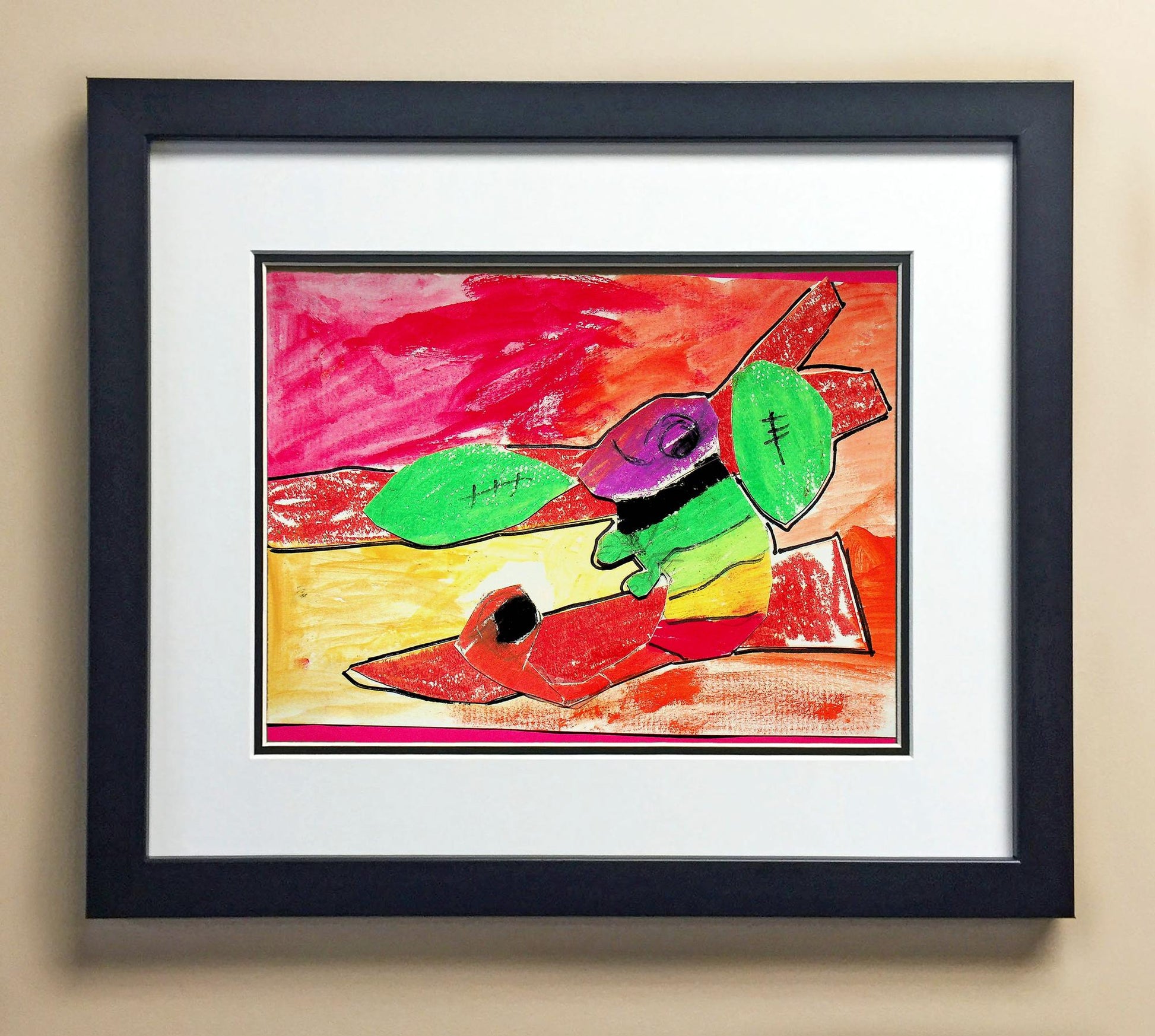 Included with the purchase is the Students Artwork, Frame, double matboard, shatter proof plexiglass, and a ready to hang backerboard with turnbuttons