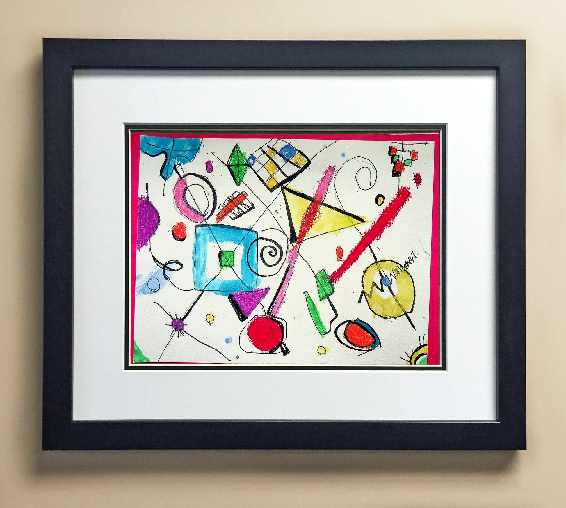 Included with the purchase is the Students Artwork, Frame, double matboard, shatter proof plexiglass, and a ready to hang backerboard with turnbuttons