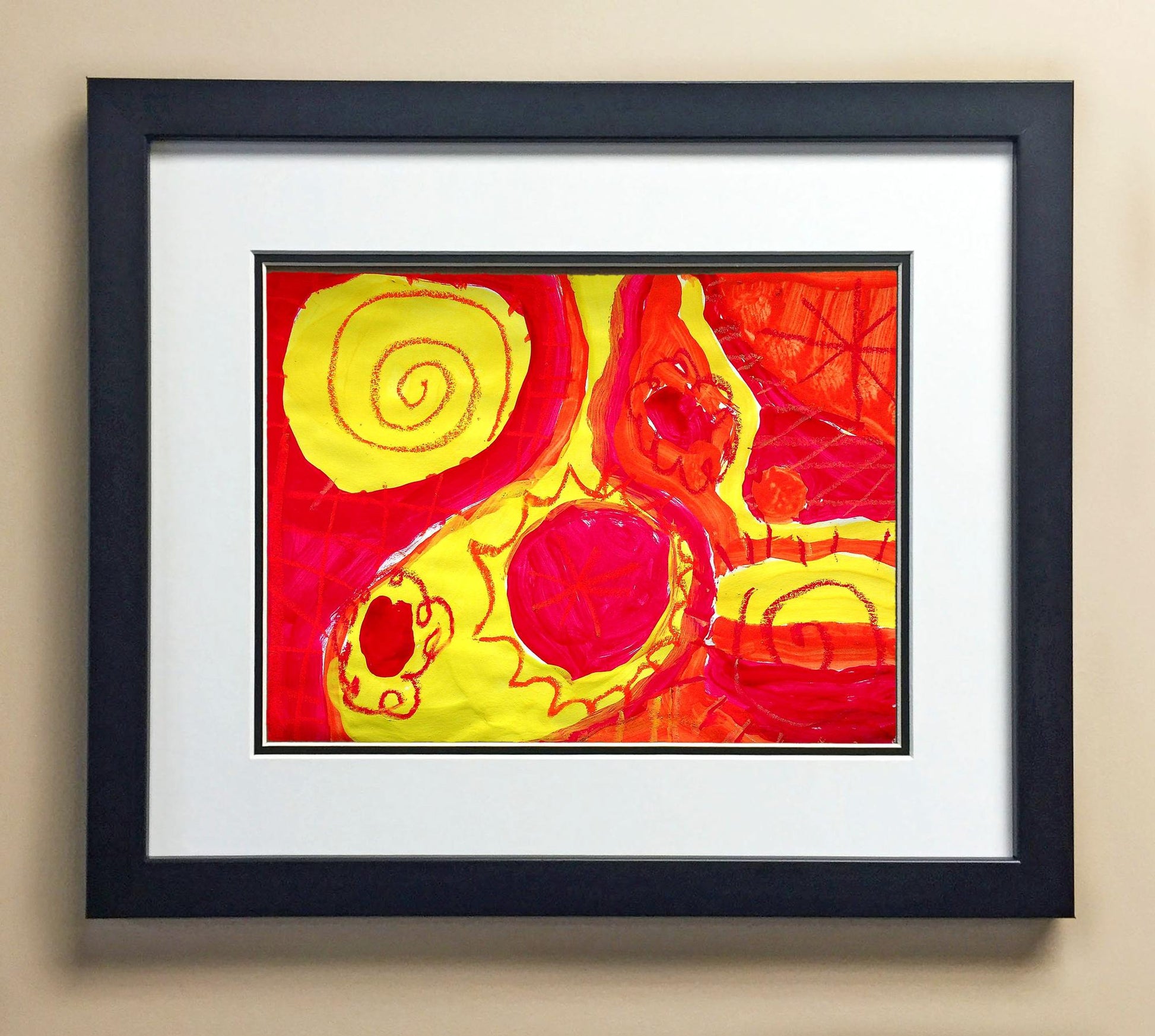 Included with the purchase is the Students Artwork, Frame, double matboard, shatter proof plexiglass, and a ready to hang backerboard with turnbuttons
