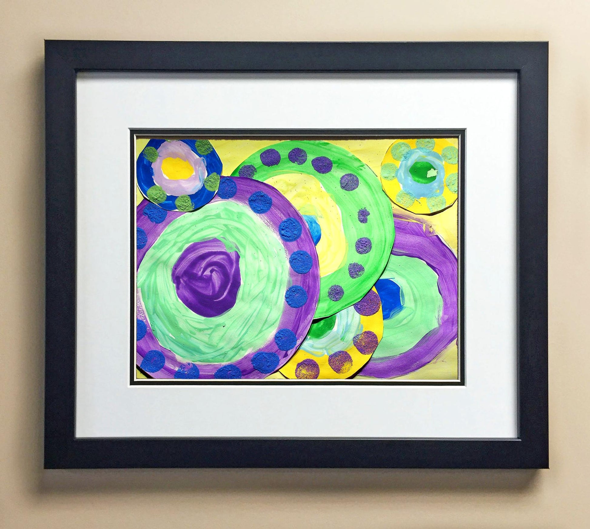 Included with the purchase is the Students Artwork, Frame, double matboard, shatter proof plexiglass, and a ready to hang backerboard with turnbuttons