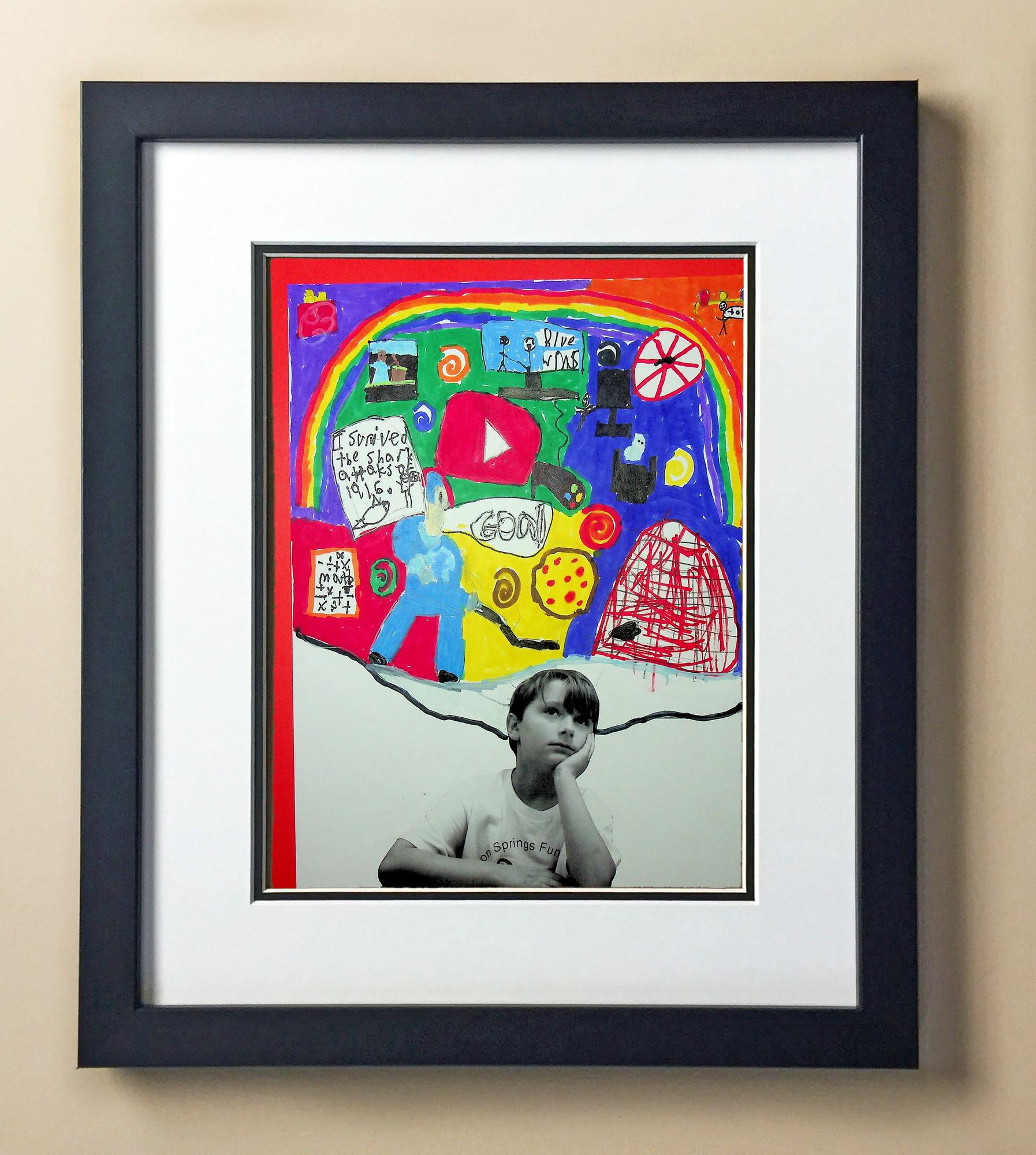Included with the purchase is the Students Artwork, Frame, double matboard, shatter proof plexiglass, and a ready to hang backerboard with turnbuttons