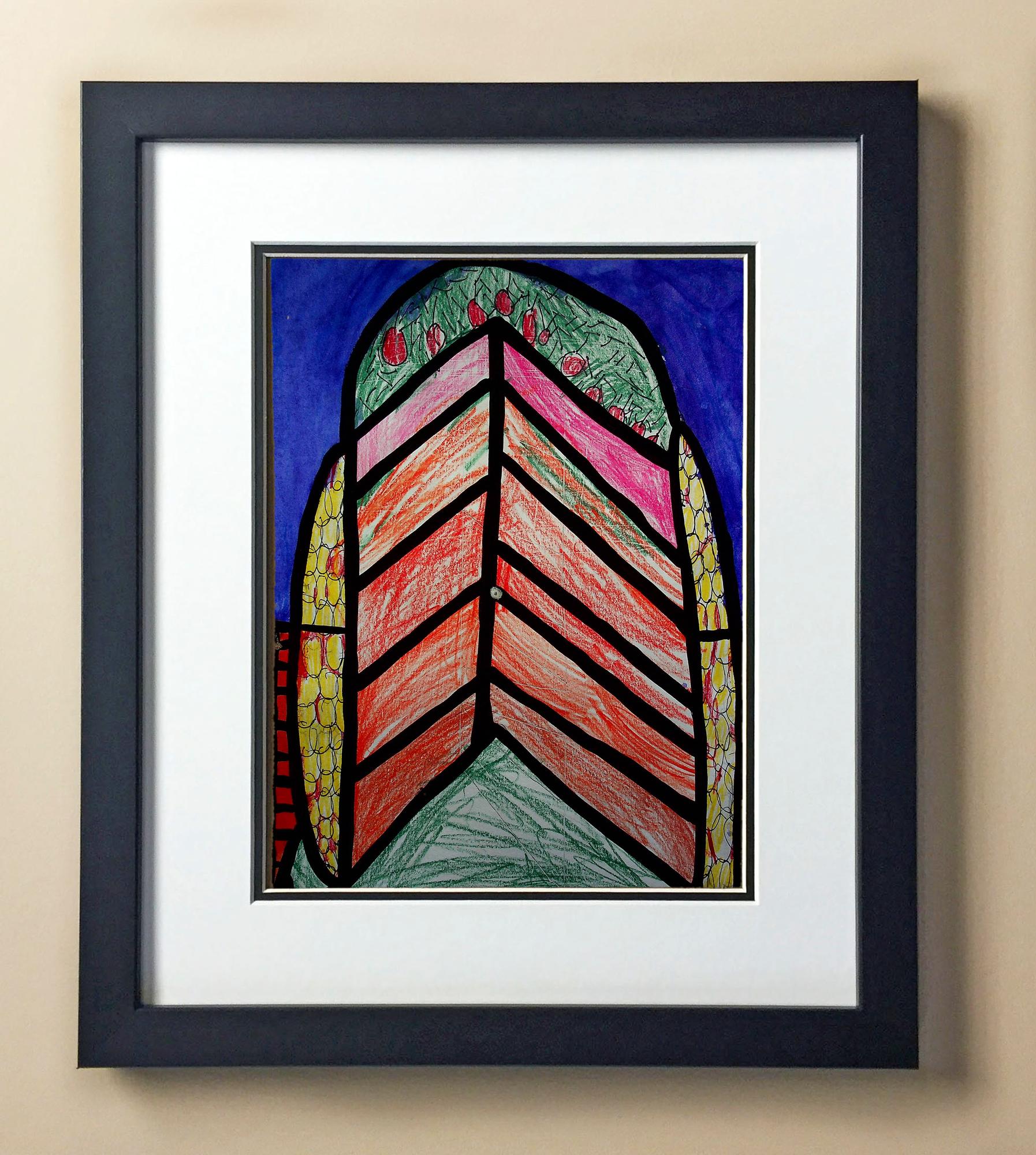 Included with the purchase is the Students Artwork, Frame, double matboard, shatter proof plexiglass, and a ready to hang backerboard with turnbuttons