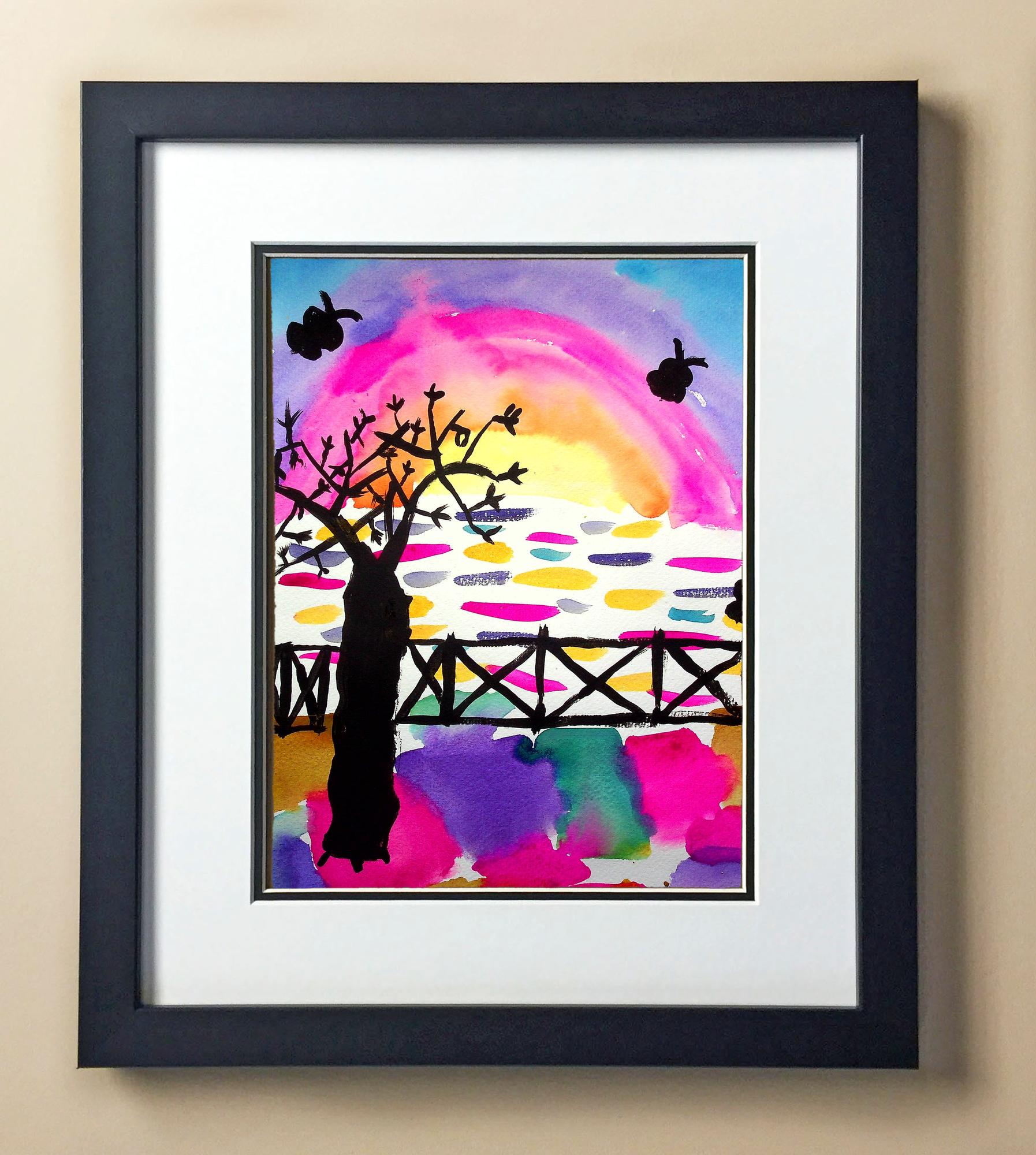 Included with the purchase is the Students Artwork, Frame, double matboard, shatter proof plexiglass, and a ready to hang backerboard with turnbuttons
