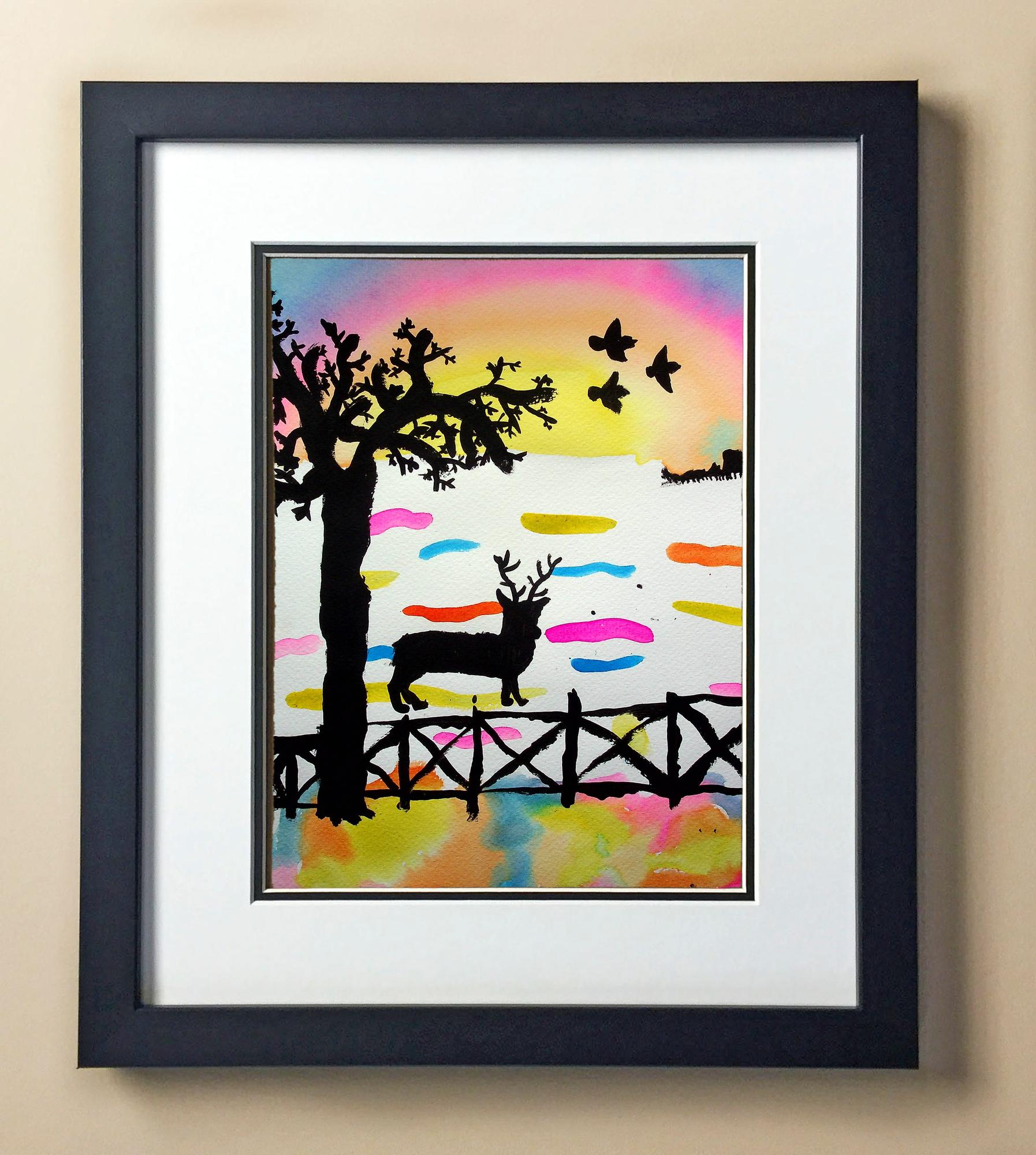 Included with the purchase is the Students Artwork, Frame, double matboard, shatter proof plexiglass, and a ready to hang backerboard with turnbuttons