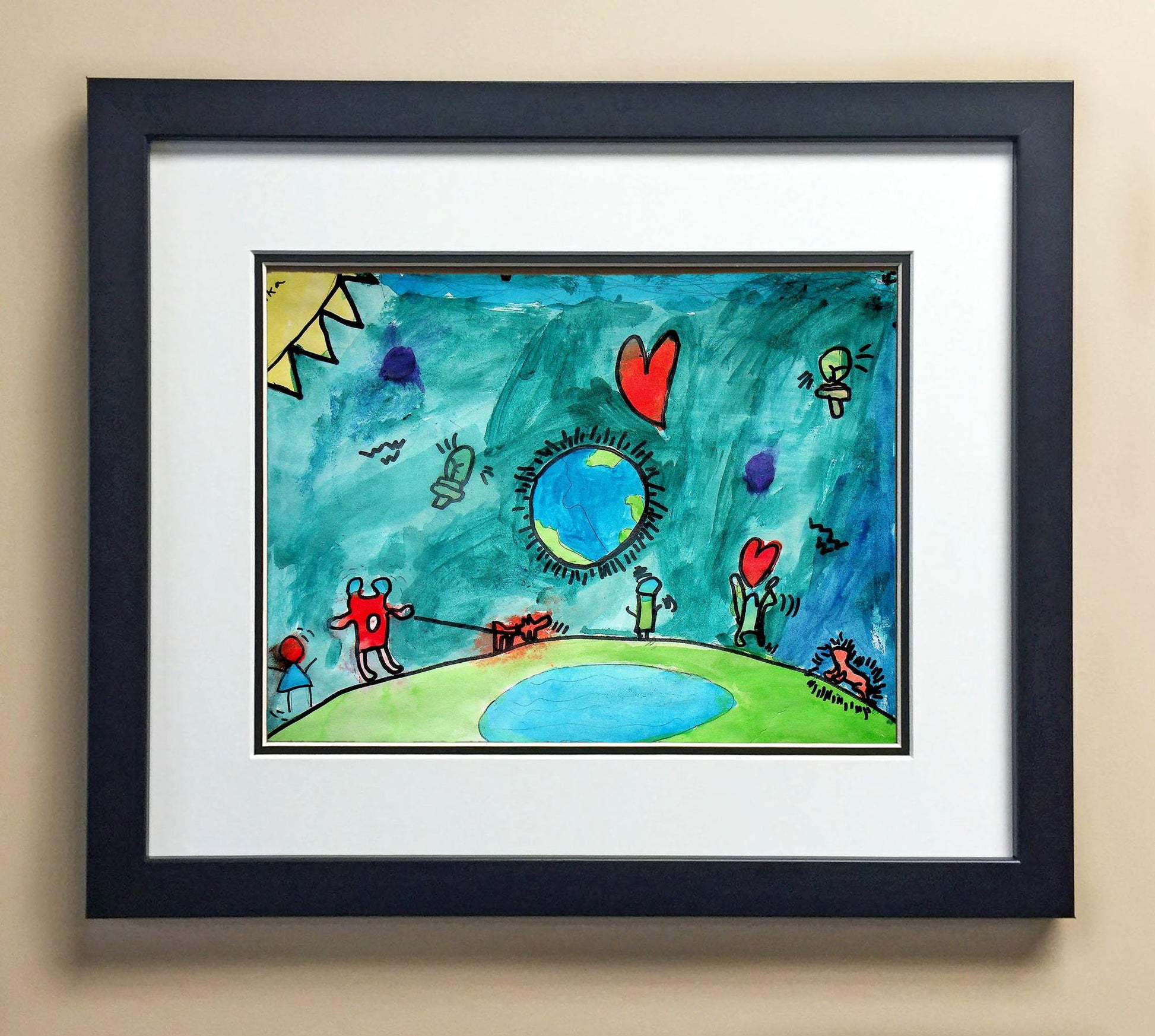 Included with the purchase is the Students Artwork, Frame, double matboard, shatter proof plexiglass, and a ready to hang backerboard with turnbuttons