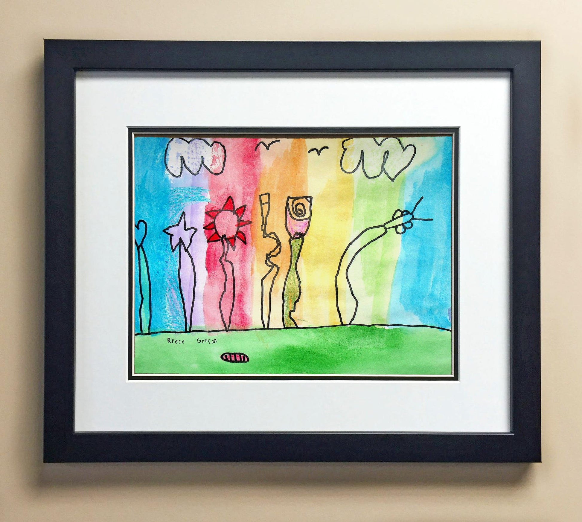 Included with the purchase is the Students Artwork, Frame, double matboard, shatter proof plexiglass, and a ready to hang backerboard with turnbuttons