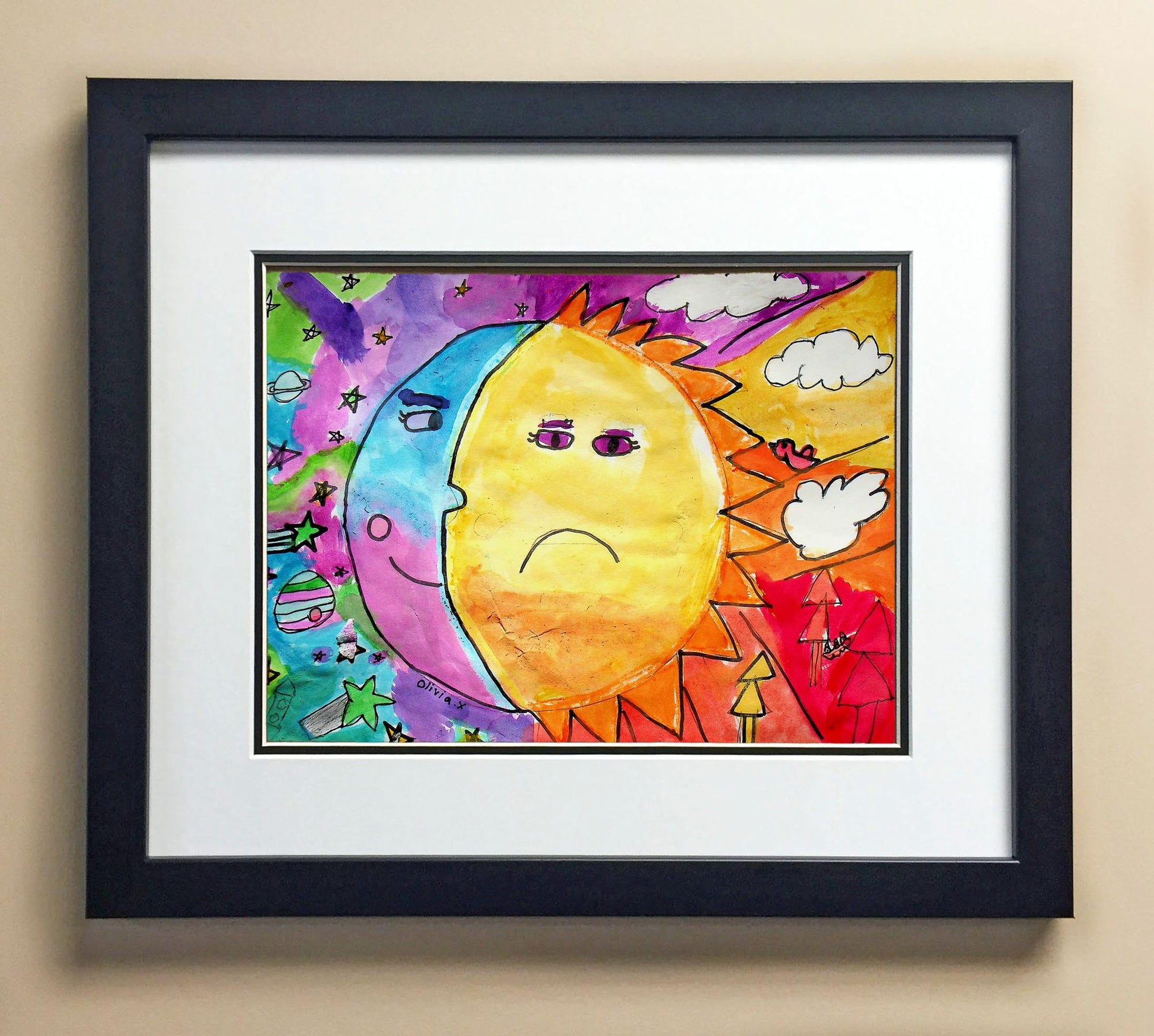 Included with the purchase is the Students Artwork, Frame, double matboard, shatter proof plexiglass, and a ready to hang backerboard with turnbuttons