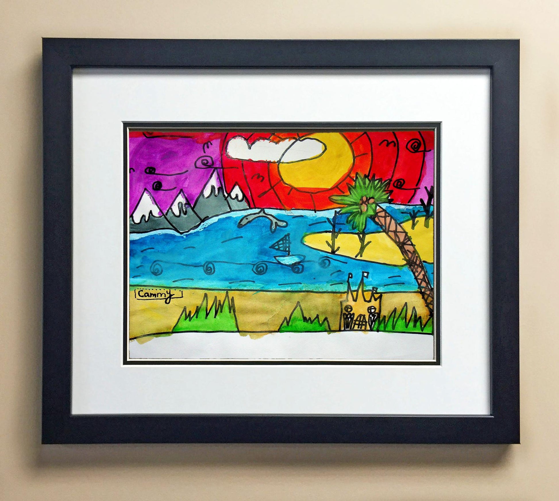 Included with the purchase is the Students Artwork, Frame, double matboard, shatter proof plexiglass, and a ready to hang backerboard with turnbuttons