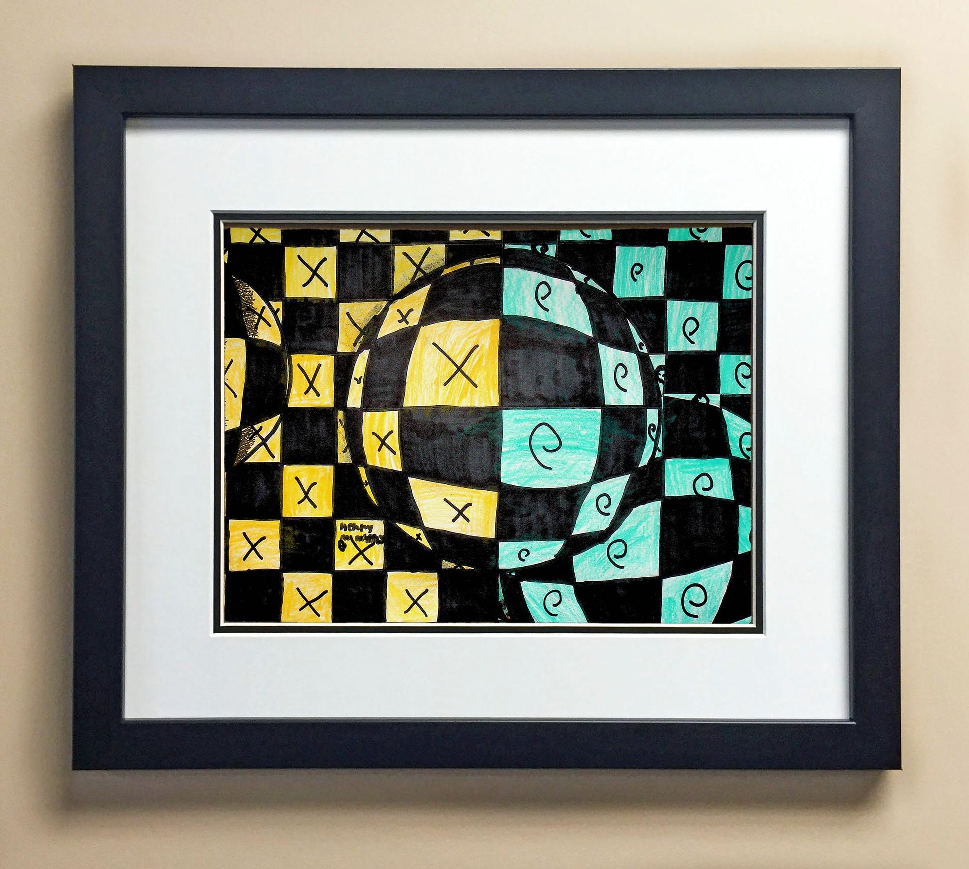 Included with the purchase is the Students Artwork, Frame, double matboard, shatter proof plexiglass, and a ready to hang backerboard with turnbuttons