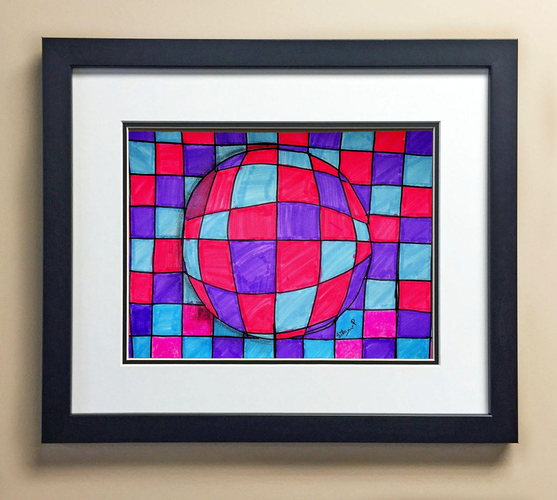 Included with the purchase is the Students Artwork, Frame, double matboard, shatter proof plexiglass, and a ready to hang backerboard with turnbuttons