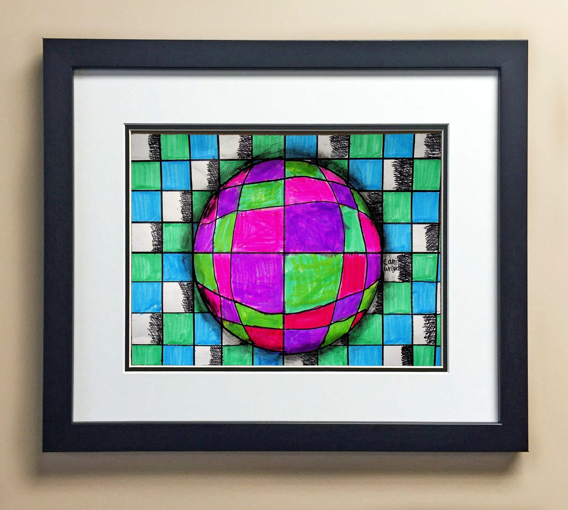 Included with the purchase is the Students Artwork, Frame, double matboard, shatter proof plexiglass, and a ready to hang backerboard with turnbuttons