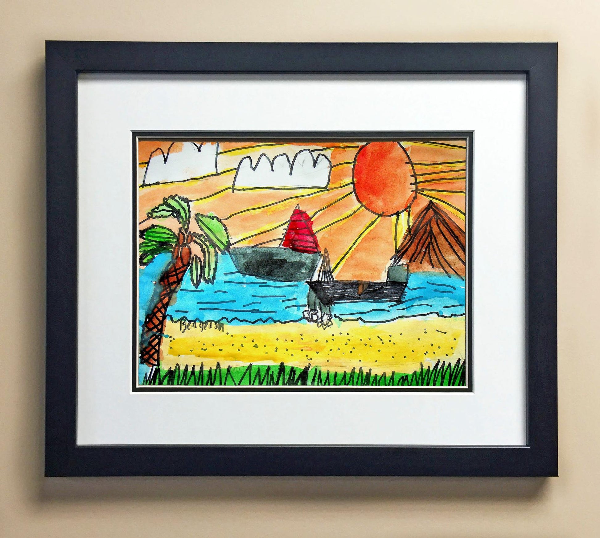 Included with the purchase is the Students Artwork, Frame, double matboard, shatter proof plexiglass, and a ready to hang backerboard with turnbuttons