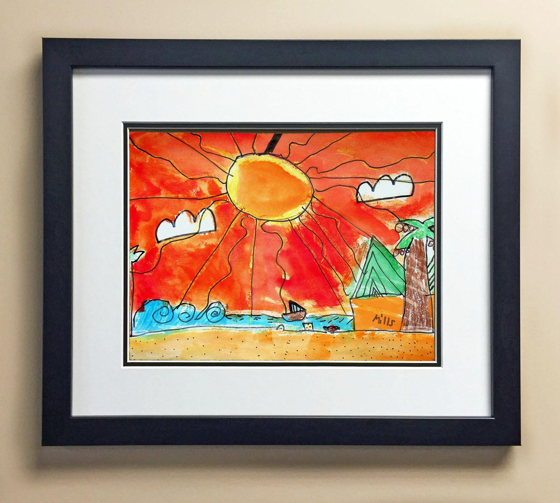Included with the purchase is the Students Artwork, Frame, double matboard, shatter proof plexiglass, and a ready to hang backerboard with turnbuttons