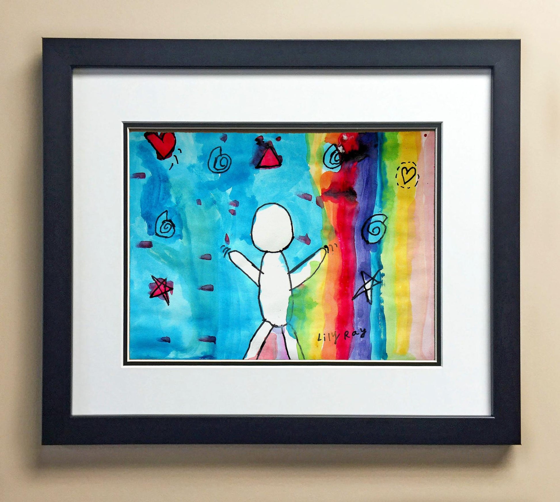 Included with the purchase is the Students Artwork, Frame, double matboard, shatter proof plexiglass, and a ready to hang backerboard with turnbuttons