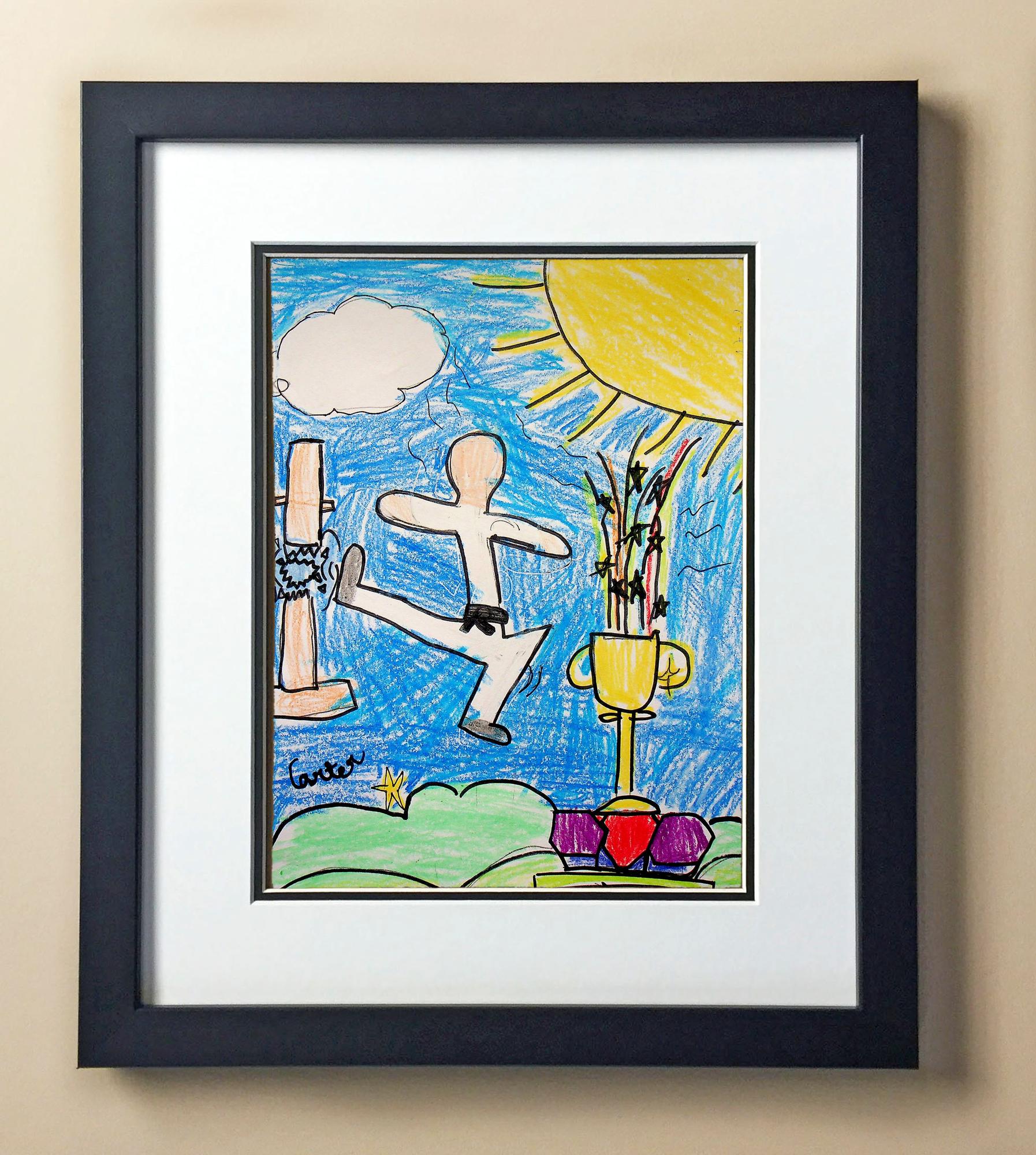 Included with the purchase is the Students Artwork, Frame, double matboard, shatter proof plexiglass, and a ready to hang backerboard with turnbuttons