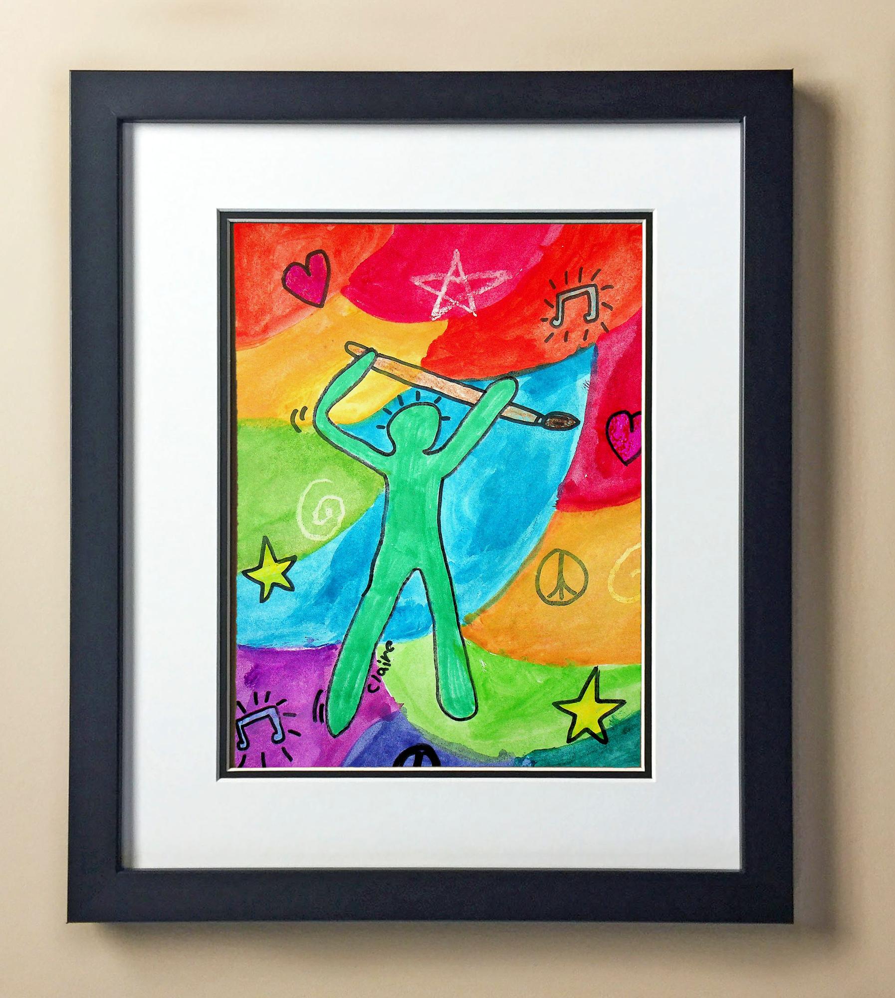 Included with the purchase is the Students Artwork, Frame, double matboard, shatter proof plexiglass, and a ready to hang backerboard with turnbuttons