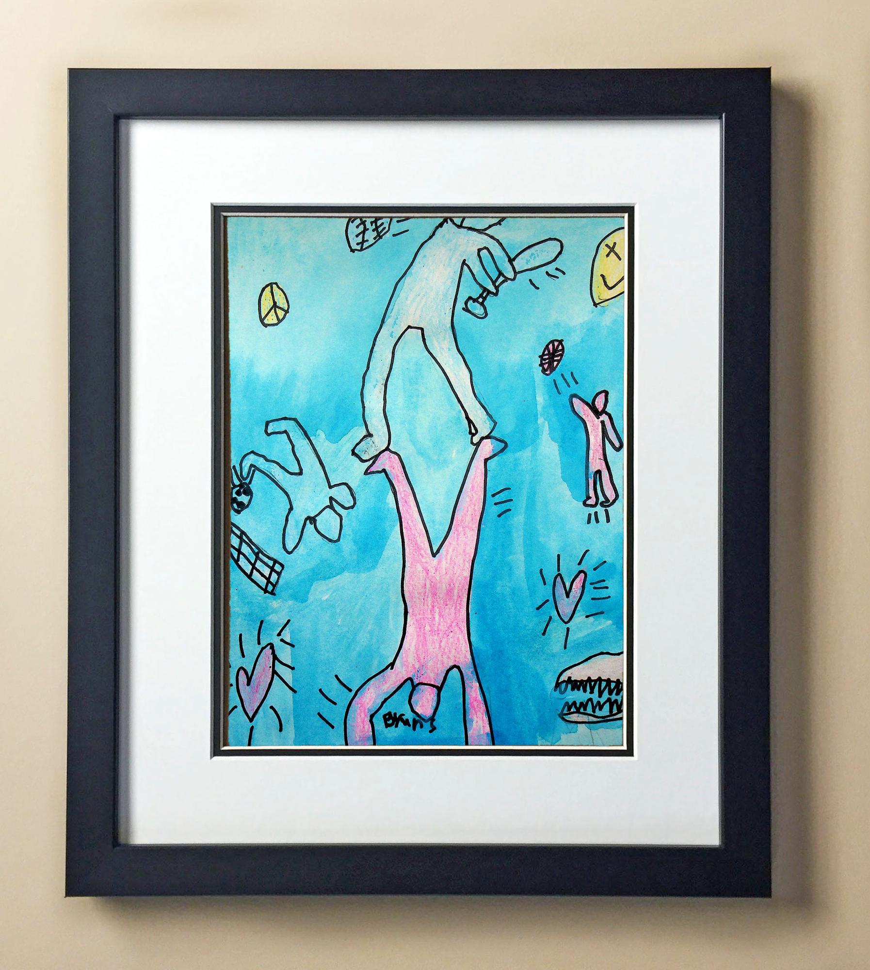 Included with the purchase is the Students Artwork, Frame, double matboard, shatter proof plexiglass, and a ready to hang backerboard with turnbuttons