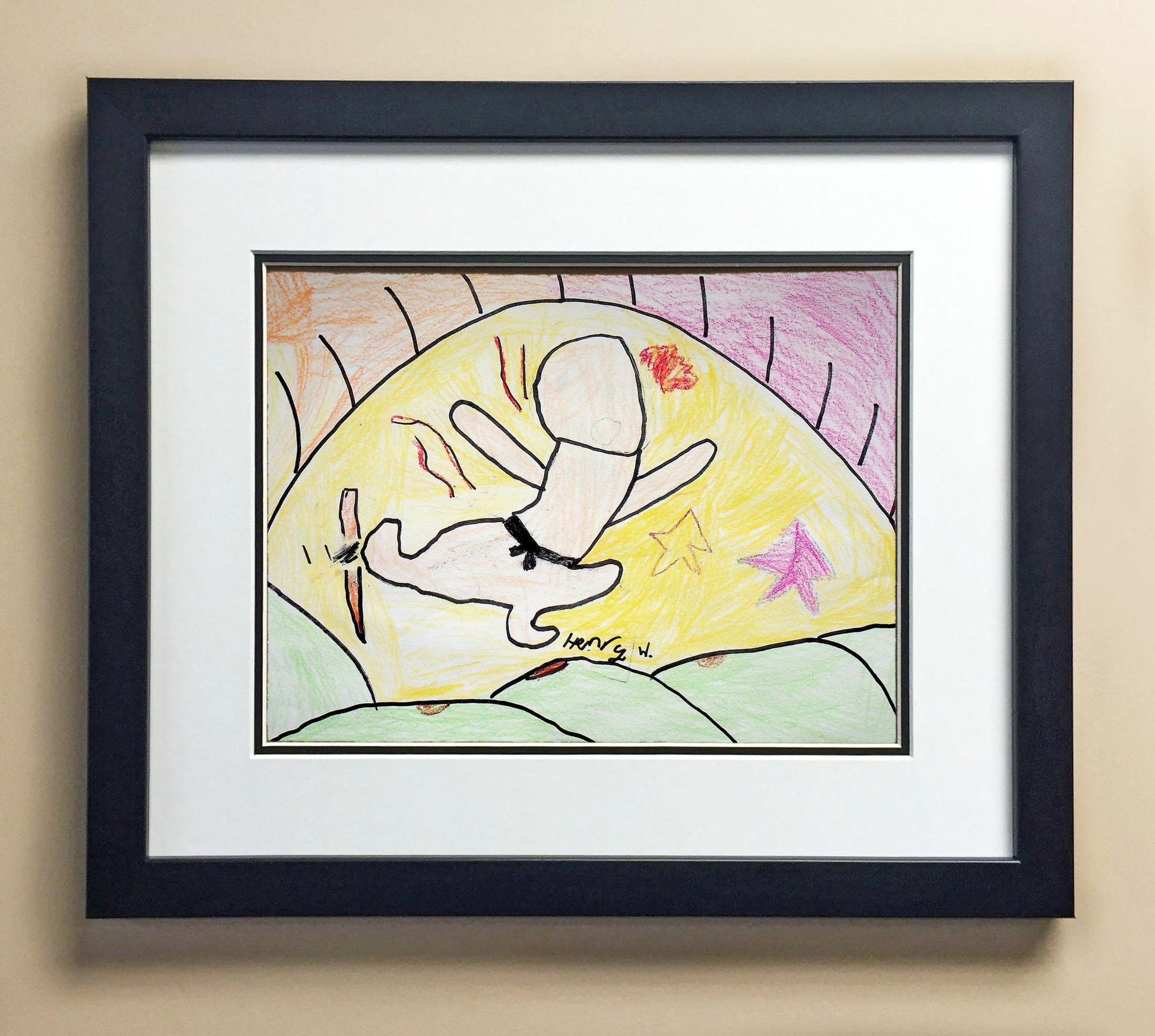 Included with the purchase is the Students Artwork, Frame, double matboard, shatter proof plexiglass, and a ready to hang backerboard with turnbuttons