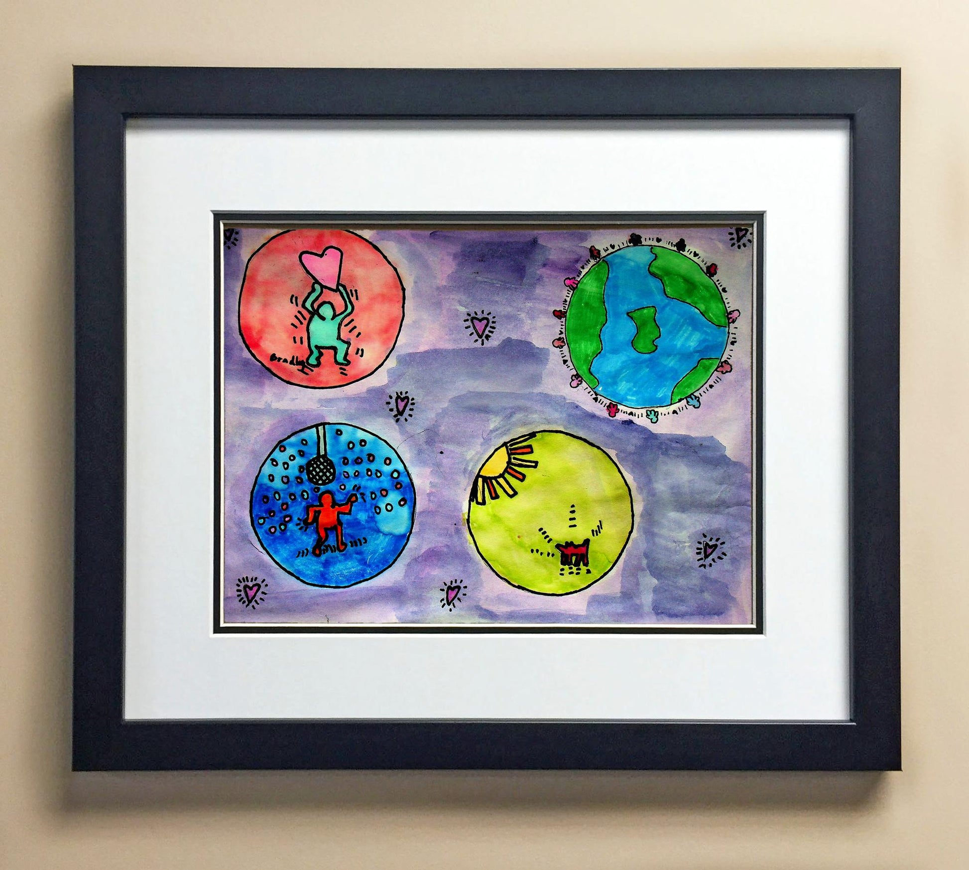 Included with the purchase is the Students Artwork, Frame, double matboard, shatter proof plexiglass, and a ready to hang backerboard with turnbuttons