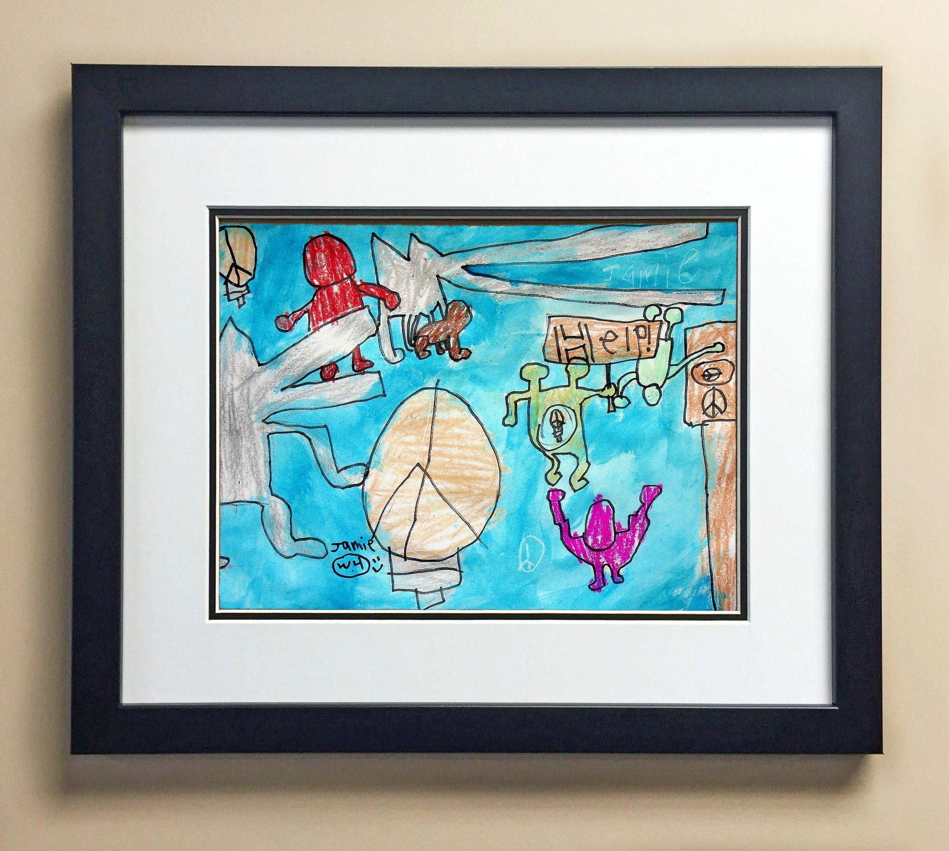 Included with the purchase is the Students Artwork, Frame, double matboard, shatter proof plexiglass, and a ready to hang backerboard with turnbuttons