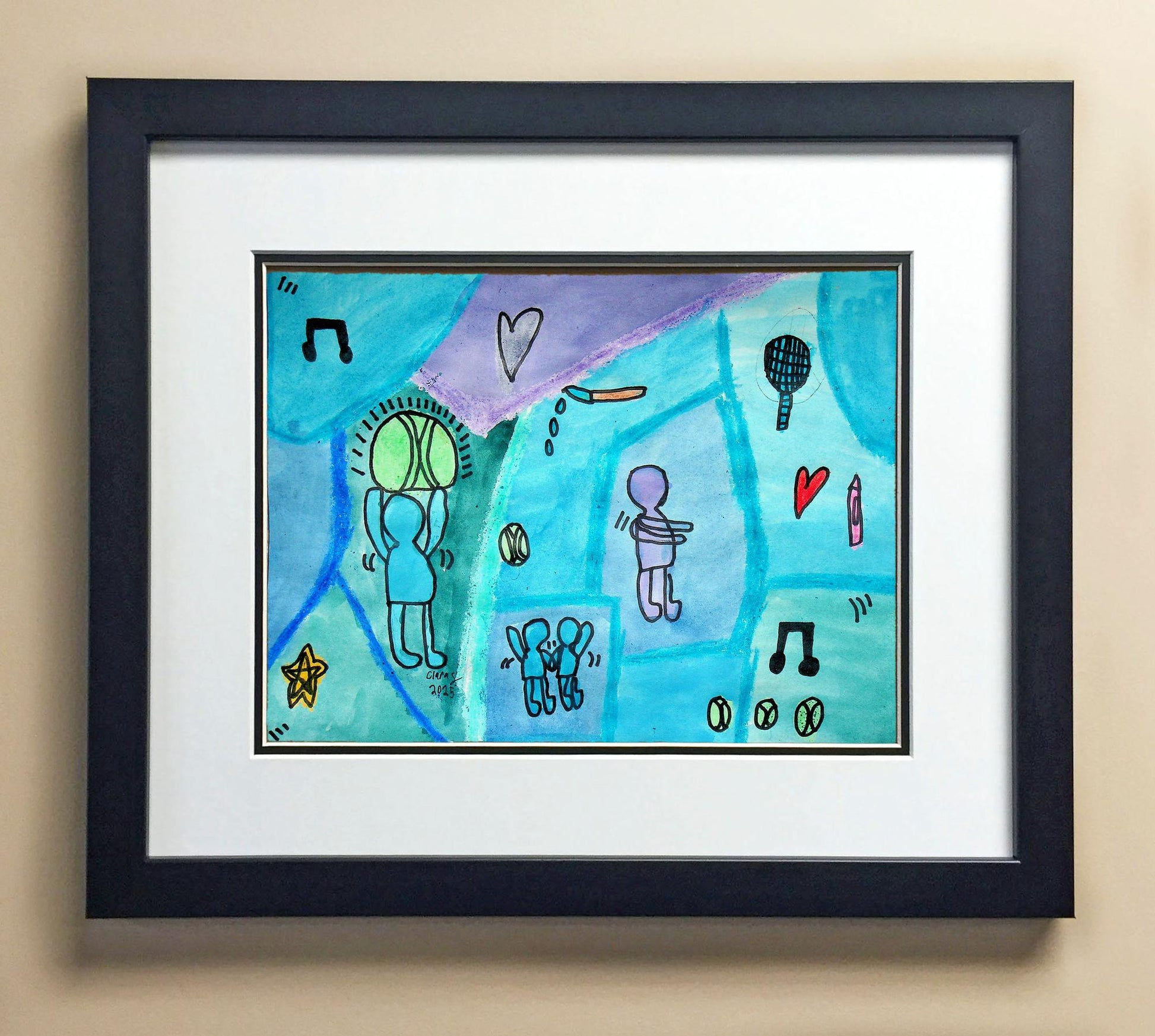 Included with the purchase is the Students Artwork, Frame, double matboard, shatter proof plexiglass, and a ready to hang backerboard with turnbuttons