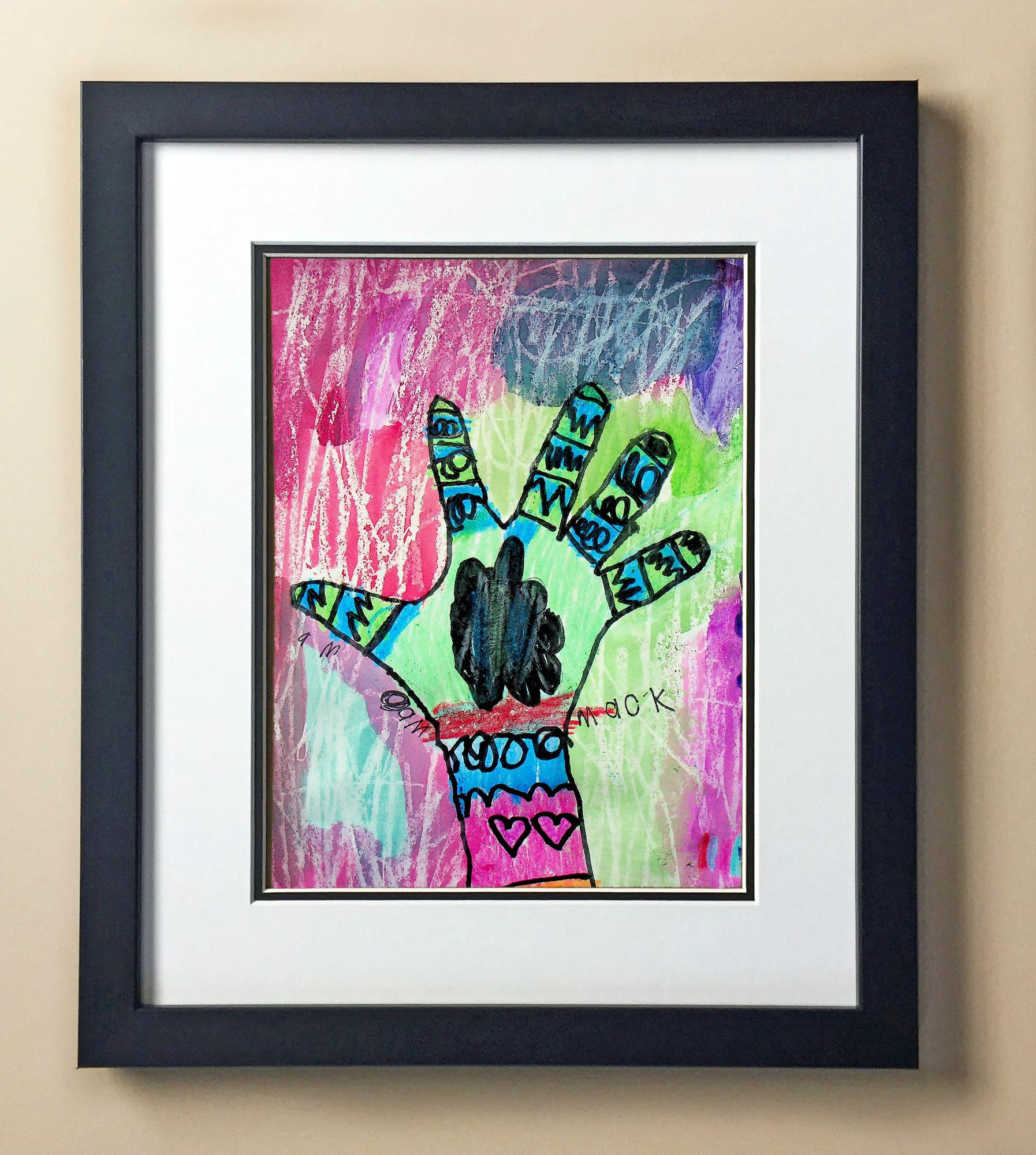 Included with the purchase is the Students Artwork, Frame, double matboard, shatter proof plexiglass, and a ready to hang backerboard with turnbuttons