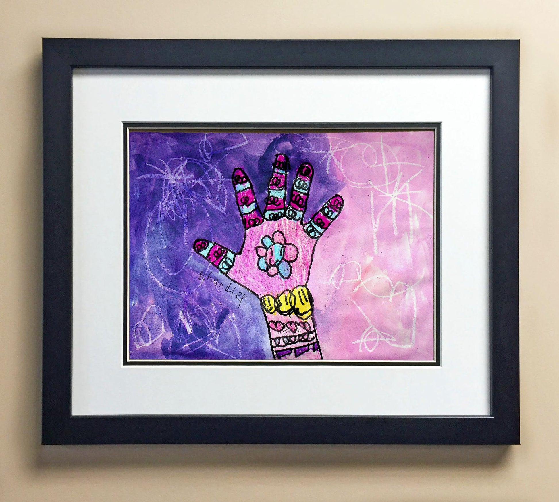 Included with the purchase is the Students Artwork, Frame, double matboard, shatter proof plexiglass, and a ready to hang backerboard with turnbuttons