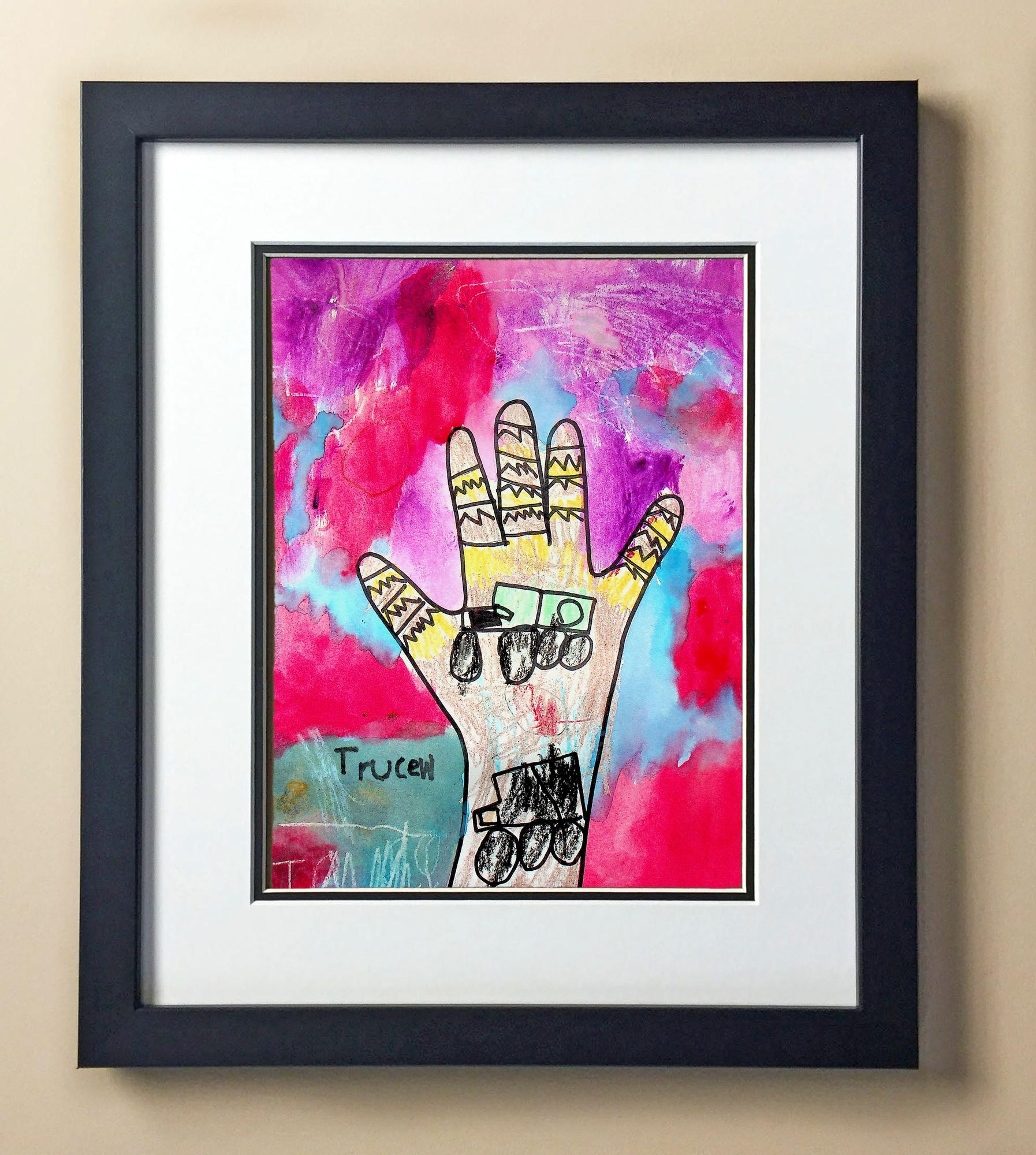 Included with the purchase is the Students Artwork, Frame, double matboard, shatter proof plexiglass, and a ready to hang backerboard with turnbuttons