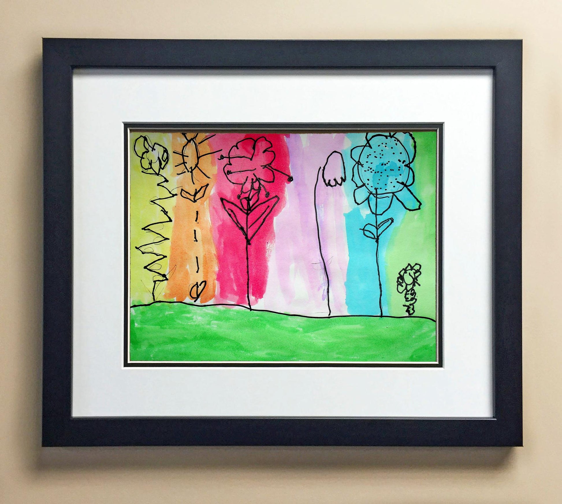 Included with the purchase is the Students Artwork, Frame, double matboard, shatter proof plexiglass, and a ready to hang backerboard with turnbuttons