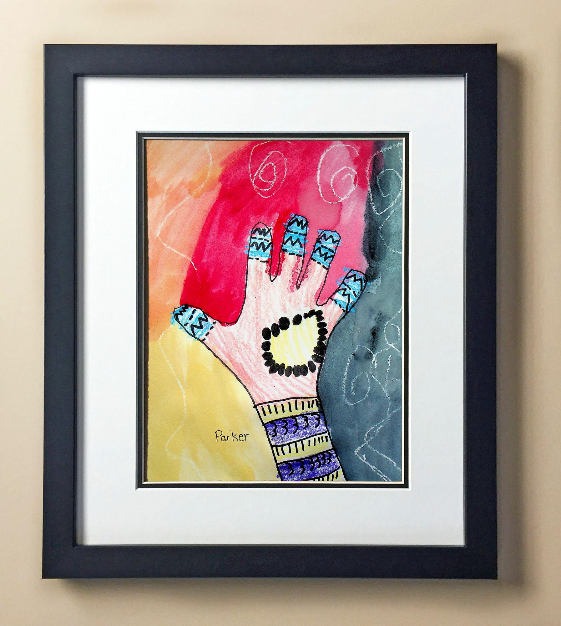 Included with the purchase is the Students Artwork, Frame, double matboard, shatter proof plexiglass, and a ready to hang backerboard with turnbuttons
