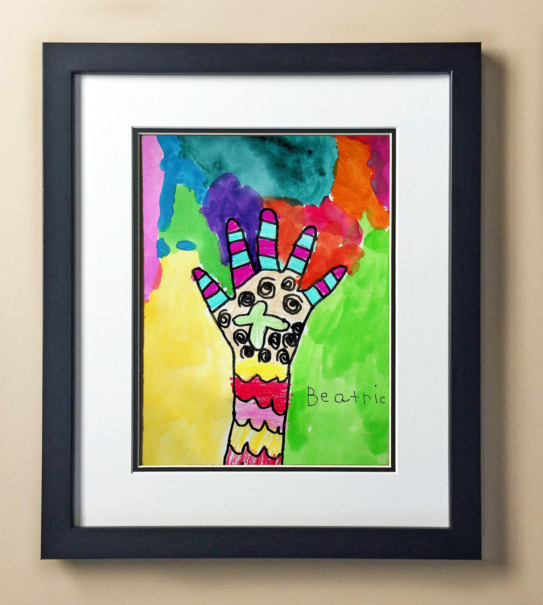 Included with the purchase is the Students Artwork, Frame, double matboard, shatter proof plexiglass, and a ready to hang backerboard with turnbuttons