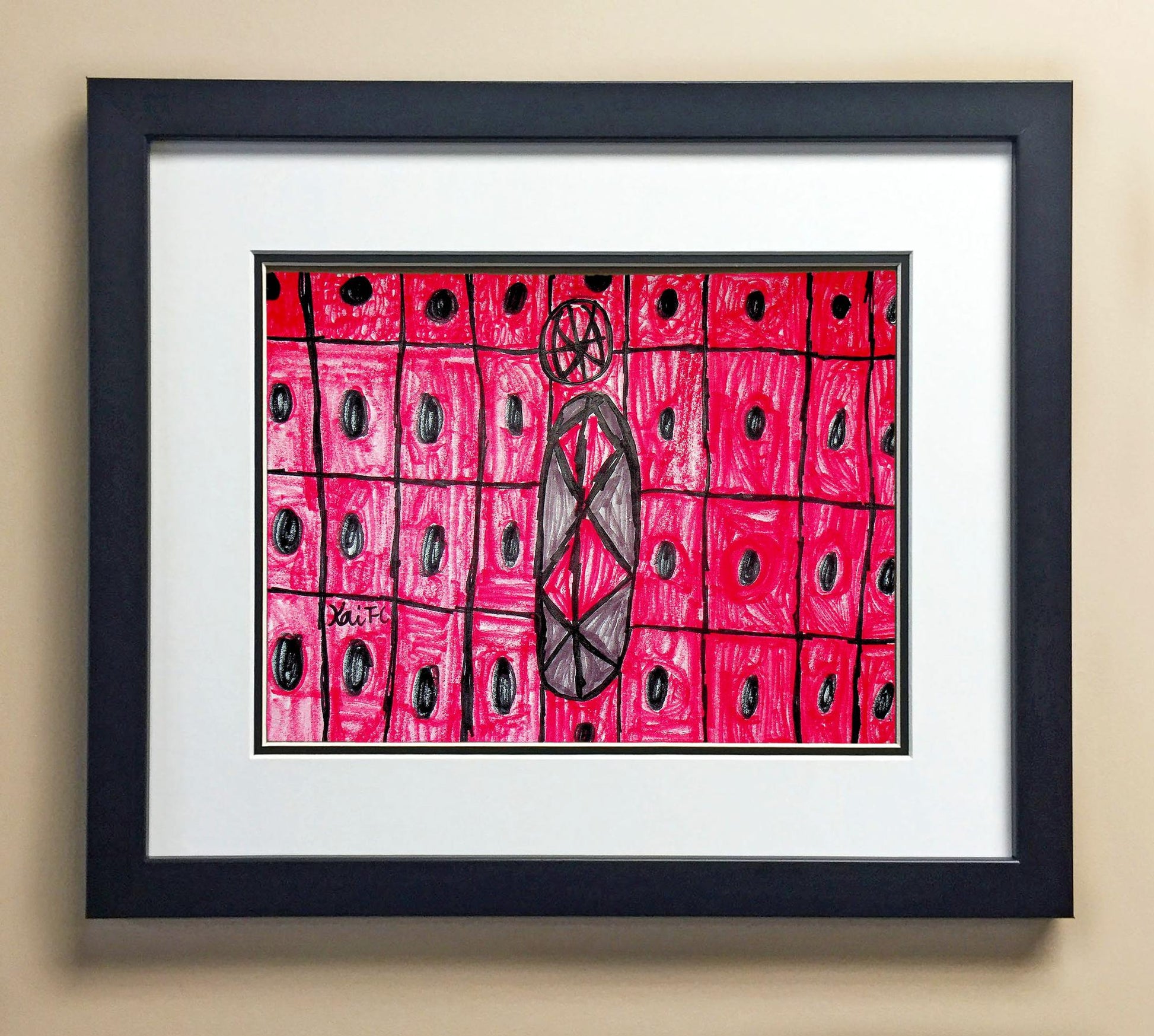 Included with the purchase is the Students Artwork, Frame, double matboard, shatter proof plexiglass, and a ready to hang backerboard with turnbuttons